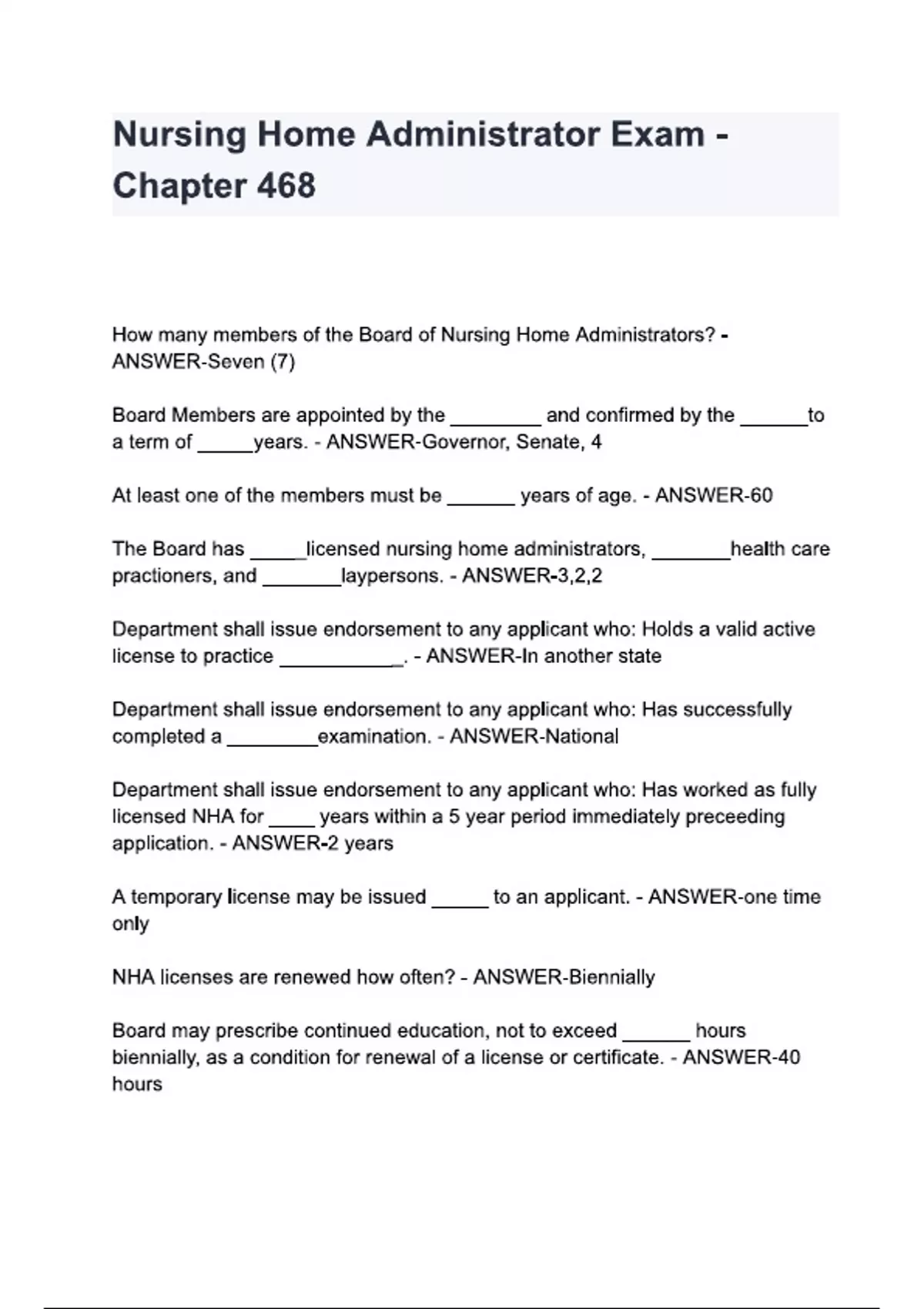 Nursing Home Administrator Exam - Chapter 468 questions and answers