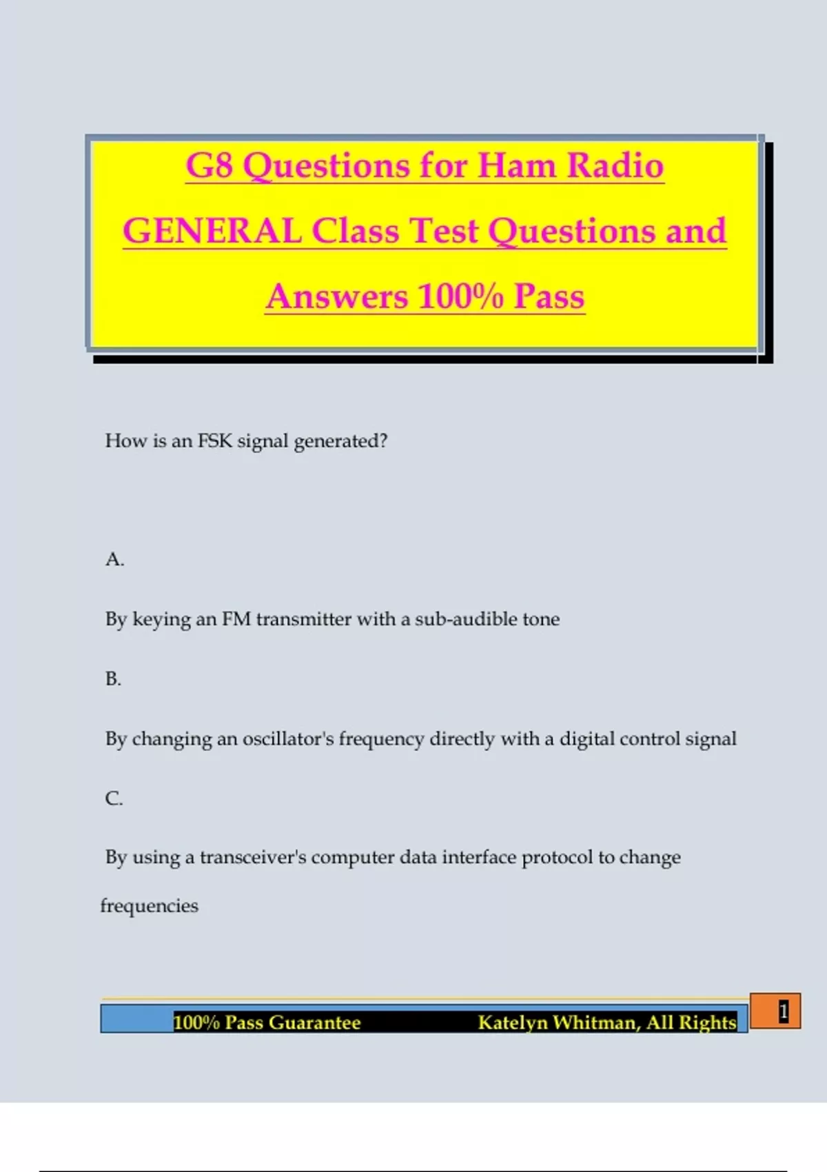 G8 Questions for Ham Radio GENERAL Class Test Questions and Answers 100% Pass How is an FSK signal generated? A. By keying an FM transmitter with a sub-audible tone B. By changing an oscillator's frequency directly with a digital control signal C. By using a transceiver's computer data interface protocol to change frequencies 2 100% Pass Guarantee Katelyn Whitman, All Rights D. By reconfiguring the CW keying input to act as a tone generator - B. By changing an oscillator's frequency directly with a digital control signal What is the name of the process that changes the phase angle of an RF wave to convey information? A. Phase convolution B. Phase modulation C. Angle convolution D. Radian inversion - B. Phase modulation 3 100% Pass Guarantee Katelyn Whitman, All Rights What is the name of the process that changes the instantaneous frequency of an RF wave to convey information? A. Frequency convolution B. Frequency transformation C. Frequency conversion D. Frequency modulation - D. Frequency modulation What emission is produced by a reactance modulator connected to a transmitter RF amplifier stage? 4 100% Pass Guarantee Katelyn Whitman, All Rights A. Multiplex modulation B. Phase modulation C. Amplitude modulation D. Pulse modulation - B. Phase modulation What type of modulation varies the instantaneous power level of the RF signal? A. Frequency shift keying B. 5 100% Pass Guarantee Katelyn Whitman, All Rights Phase modulation C. Frequency modulation D. Amplitude modulation - D. Amplitude modulation What is one advantage of carrier suppression in a single sideband phone transmission versus full carrier amplitude modulati