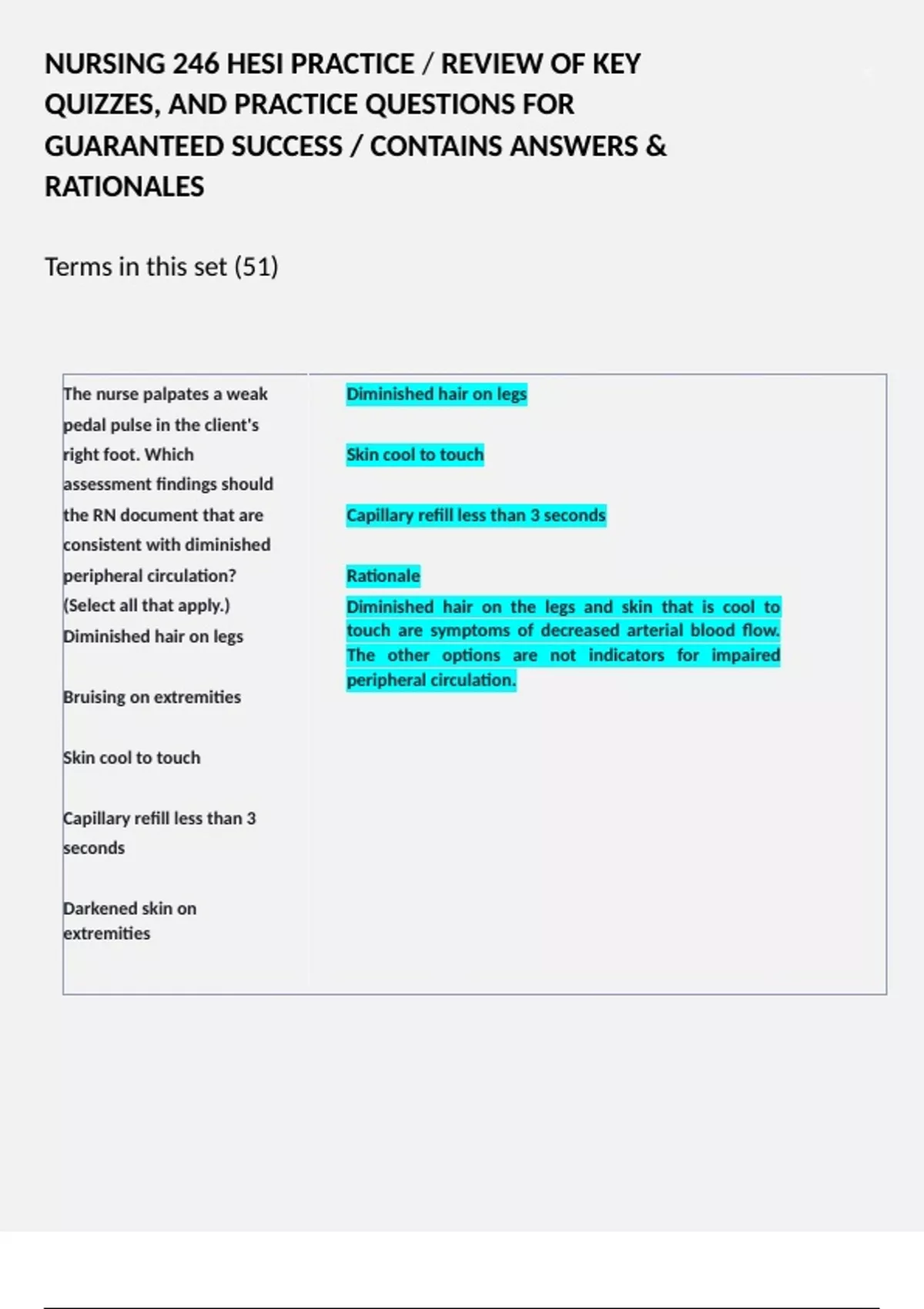 NURSING 246 HESI PRACTICE / REVIEW OF KEY QUIZZES, AND PRACTICE QUESTIONS FOR GUARANTEED SUCCESS / CONTAINS ANSWERS & RATIONALES Terms in this set (51) The nurse palpates a weak pedal pulse in the client's right foot. Which assessment findings sh