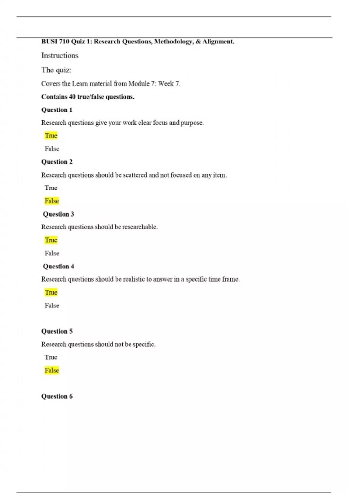 BUSI 710 Quiz 1: Research Questions, Methodology, & Alignment|Questions and Answers|2025 Update|100% Correct.