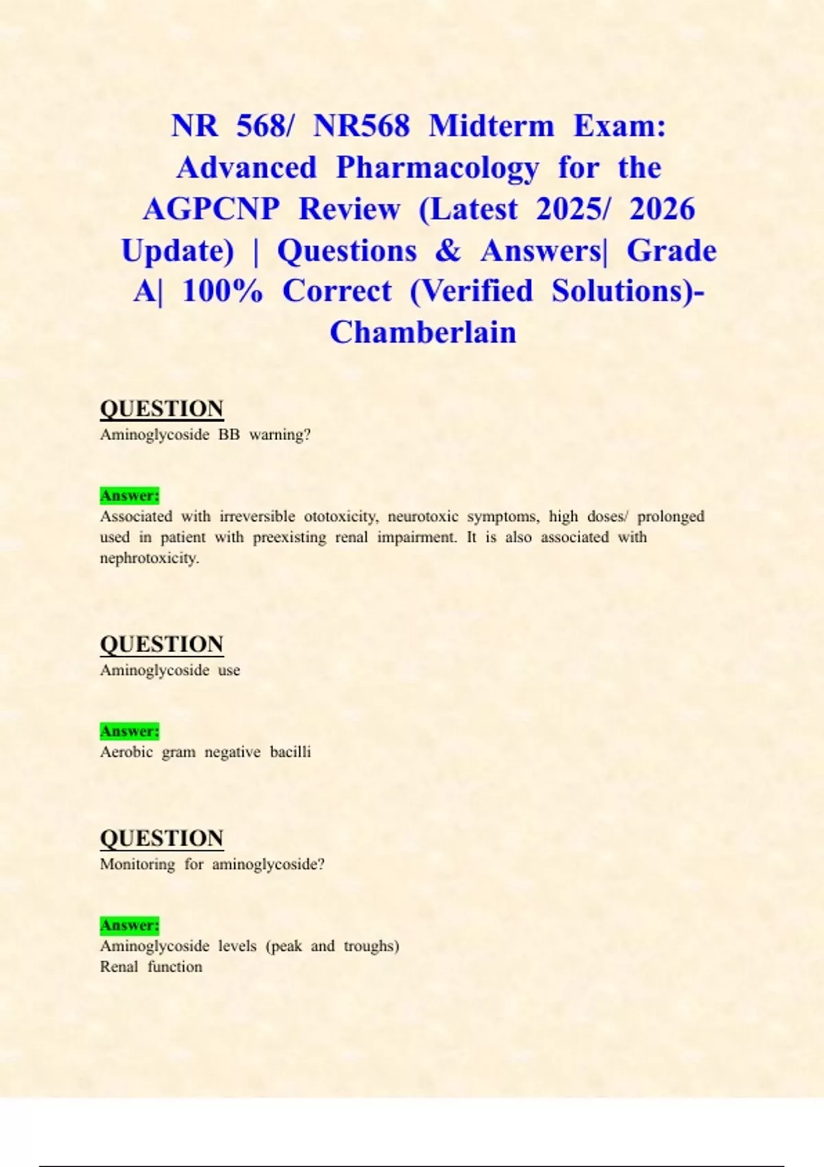 NR 568/ NR568 Midterm Exam: Advanced Pharmacology for the AGPCNP Review (Latest 2025/ 2026 Update) | Questions & Answers| Grade A| 100% Correct (Verified Solutions)- Chamberlain