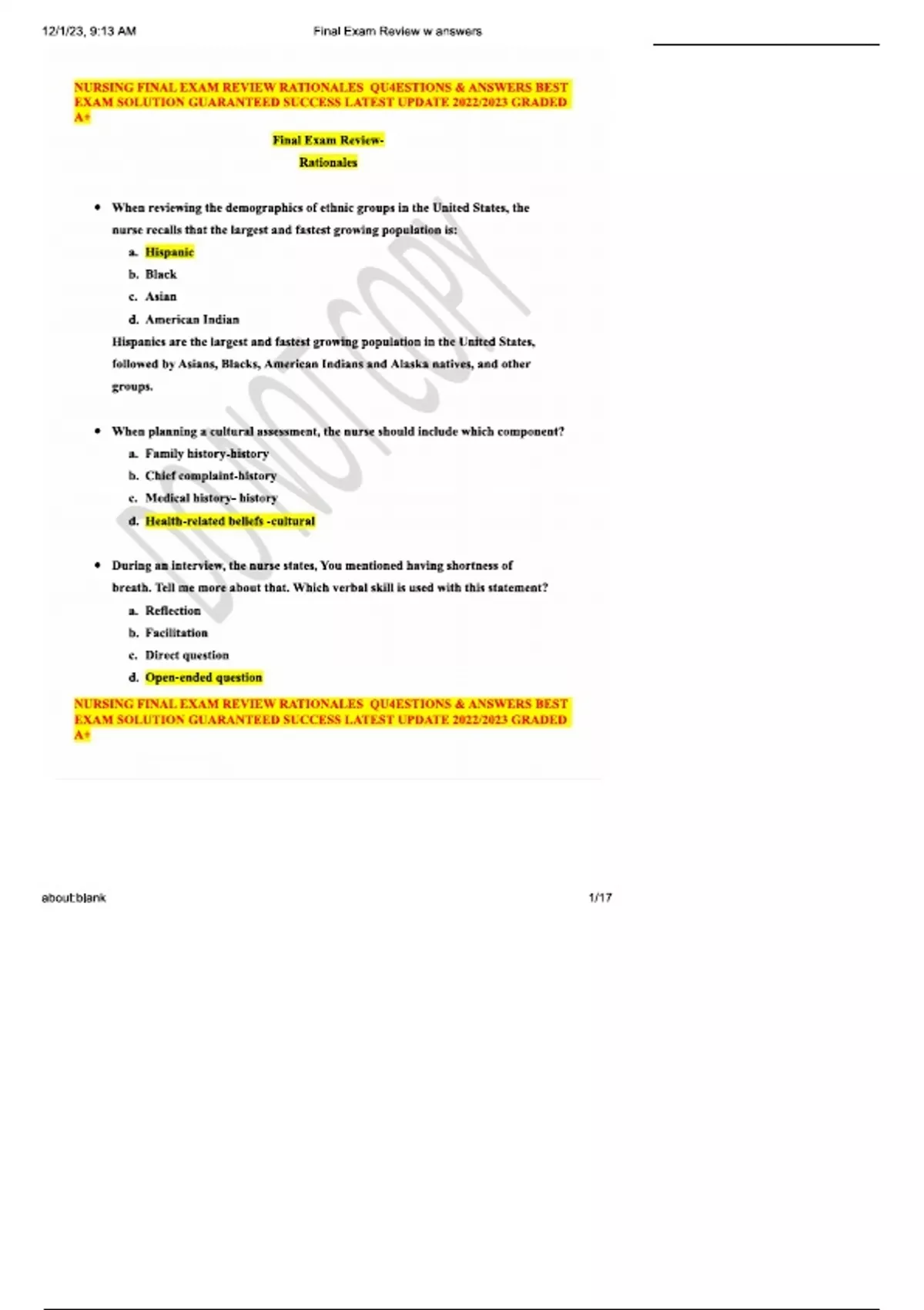 Final Exam Review w answers - Nursing (NR546) 2024.