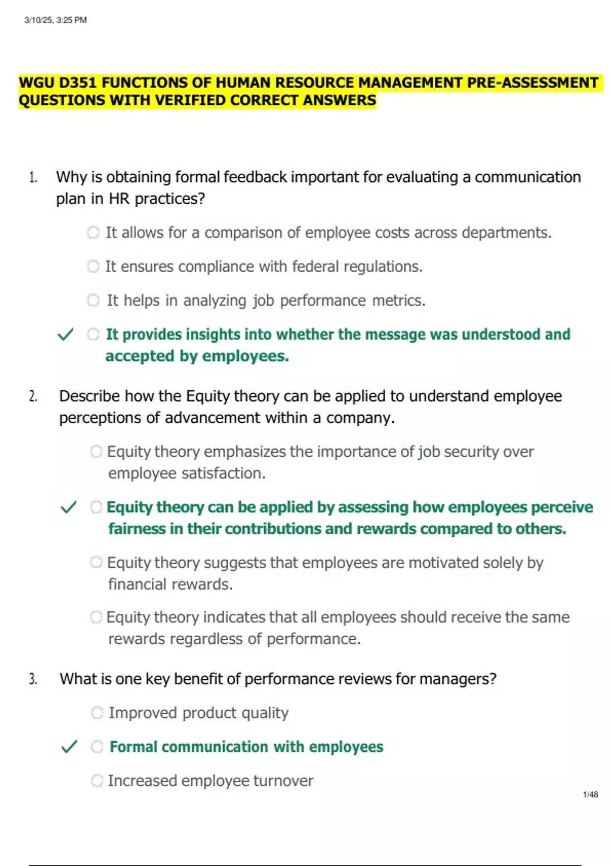 Why is obtaining formal feedback important for evaluating a communication plan in HR practices? It allows for a comparison of employee costs across departments. It ensures compliance with federal regulations. It helps in analyzing job performance metrics. It provides insights into whether the message was understood and accepted by employees. 2. Describe how the Equity theory can be applied to understand employee perceptions of advancement within a company. Equity theory emphasizes the importance of job security over employee satisfaction. Equity theory can be applied by assessing how employees perceive fairness in their contributions and rewards compared to others. Equity theory suggests that employees are motivated solely by financial rewards. Equity theory indicates that all employees should receive the same rewards regardless of performance. 3. What is one key benefit of performance reviews for managers? Improved product quality Formal communication with em
