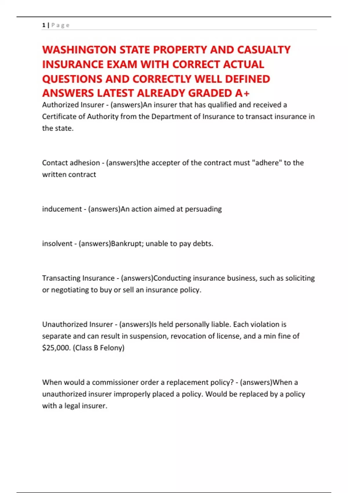 INSURANCE EXAM WITH CORRECT ACTUAL
