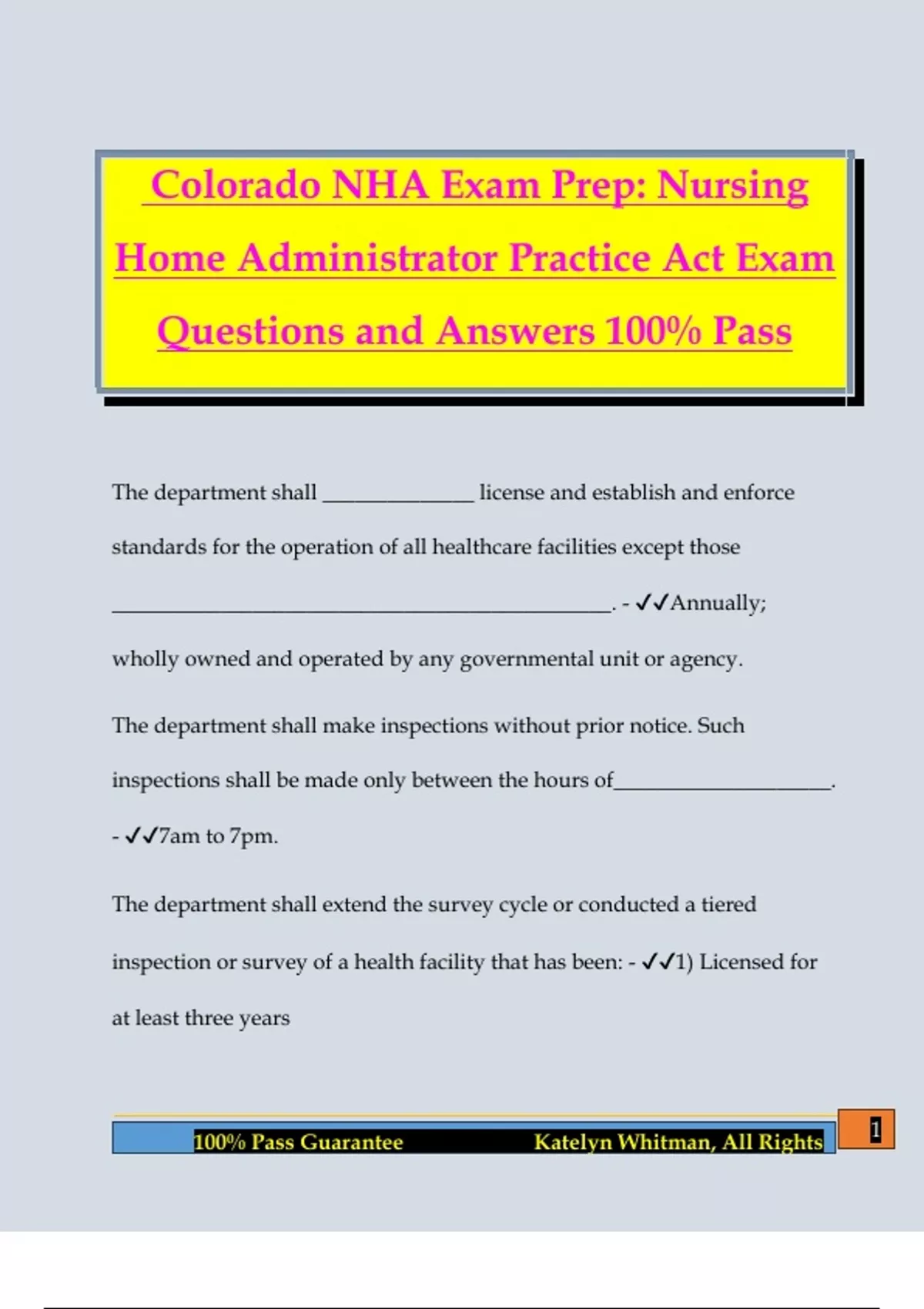 Colorado NHA Exam Prep: Nursing Home Administrator Practice Act Exam Questions and Answers 100% Pass The department shall ______________ license and establish and enforce standards for the operation of all healthcare facilities except those ______________________________________________. - Annually; wholly owned and operated by any governmental unit or agency. The department shall make inspections without prior notice. Such inspections shall be made only between the hours of____________________. - 7am to 7pm. The department shall extend the survey cycle or conducted a tiered inspection or survey of a health facility that has been: - 1) Licensed for at least three years 2 100% Pass Guarantee Katelyn Whitman, All Rights 2) has had no enforcement activity taken against it. 3) has no patterns of deficient practice 4)has no substantiated complaints resulting in the discovery of significant deficiencies that may negatively affect the
