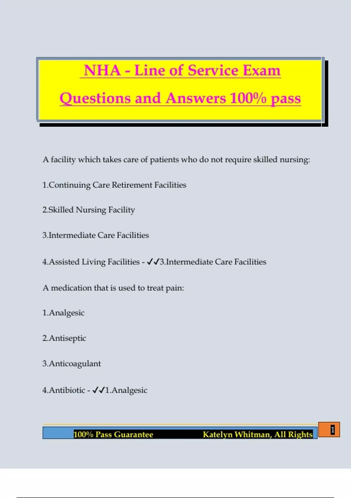 NHA - Line of Service Exam Questions and Answers 100% pass A facility which takes care of patients who do not require skilled nursing: 1.Continuing Care Retirement Facilities 2.Skilled Nursing Facility 3.Intermediate Care Facilities 4.Assisted Living Facilities - 3.Intermediate Care Facilities A medication that is used to treat pain: 1.Analgesic 2.Antiseptic 3.Anticoagulant 4.Antibiotic - 1.Analgesic 2 100% Pass Guarantee Katelyn Whitman, All Rights Which of the following is not an appropriate method to control wandering: 1.Restricting the wanderer to bed with physical restraints 2.Locked Alzheimer wards with a door requiring a passcode to exit 3.Bracelet work by the resident that triggers a door lock as the resident approaches 4.Mesh Velcro barriers on other residents' doors - 1.Restricting the wanderer to bed with physical restraints Turning up for work on time is an indication of a good: 1.Work Attitude 2.Organizational Reward 3.Social Reward 4.Job Reward - 1.Work Attitude In a well-run facility, the balance between nursing care staff and support staff is: 1.60%Nursing care/40% support staff 3 100% Pass Guarantee Katelyn Whitman, All Rights 2.70%Nursing care/30% support staff 3.40%Nursing care/60% support staff 4.50%Nursing care/50% support staff - 1.60%Nursing care/40% support staff A chronic nervous disease: 1.Parkinson's 2.Sun-downing 3.Aphasia 4.Senile Dementia - 1.Parkinson's Determining the task and skills required to fulfill a position: 1.Job Classification 2.Job Analysis 3.Job Description 4.Job - 2.Job Analysis An employee permanently leaving a position: 4 100% Pass Guarantee Katelyn Whitman, All Rights 1.Exit Interview 2.Performance Evaluation 3.Employee Turnover 4.Promotion Policy - 3.Employee Turnover Instructions phrased as a suggestion: 1.General 2.Formal 3.Specific 4.Informal - 4.Informal How long much a resident wait before re-qualifying for medicare reimbursement after their original stay in a SN