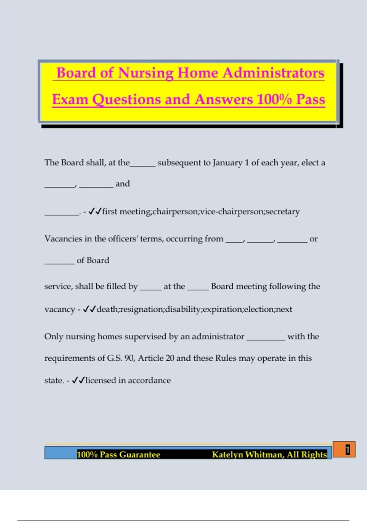 Board of Nursing Home Administrators Exam Questions and Answers 100% Pass The Board shall, at the______ subsequent to January 1 of each year, elect a _______, ________ and ________. - first meeting;chairperson;vice-chairperson;secretary Vacancies in the officers' terms, occurring from ____, ______, _______ or _______ of Board service, shall be filled by _____ at the _____ Board meeting following the vacancy - death;resignation;disability;expiration;election;next Only nursing homes supervised by an administrator _________ with the requirements of G.S. 90, Article 20 and these Rules may operate in this state. - licensed in accordance 2 100% Pass Guarantee Katelyn Whitman, All Rights Administrator of Record - means the licensed administrator who is physically present in the facility for an amount of time sufficient to assure the facility's substantial compliance with applicable state and federal laws and rules The license is a ______ certificate. An additional current _______ is issued each time a licensee renews his license. One part is to be ______ to and displayed with the license. The second part provided is a ______. - permanent;two-part registration card;affixed;wallet card Practice of nursing home administration - means the performance of any act or the making of any decision involved in the planning, organizing, directing, and/or control of the operation of a nursing home. Rule-making petitions shall be sent to _______. No special form is required, but the petitioner shall state his ____ and _____. - the Executive Director;name and address 3 100% Pass Guarantee Katelyn Whitman, All Rights The following shall be included in the (rule making) petition - (1) a draft of the proposed rule; (2) the reason for its proposal; (3) the effect of the proposed rule on existing rules or decisions; (4) data supporting the proposed rule; (5) practices likely to be affected by the proposed rule; (6) persons likely to be affected by the proposed rule. The Executive Director shall review the petition and develop a recommendation as to whether the petitioner's proposed rule should be rejected or implemented. The Executive Director shall present the petition and his recommendation to the Board ______________, and the Board shall render its decision to either ______or _______. The Board shall notify the petitioner of its decision in writing within the period set by G.S. 150B-20 - at its next regu