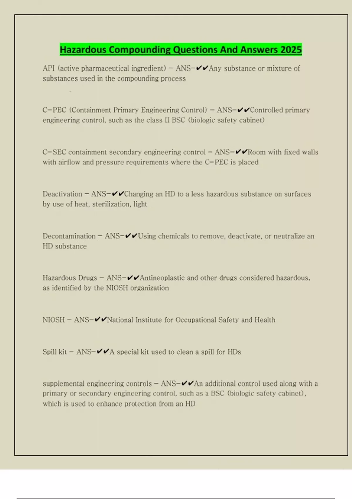 Hazardous Compounding Questions And Answers 2025 API (active pharmaceutical ingredient) - ANS-Any substance or mixture of substances used in the compounding process C-PEC (Containment Primary Engineering Control) - ANS-Controlled primary engineering control, such as the class II BSC (biologic safety cabinet) C-SEC containment secondary engineering control - ANS-Room with fixed walls with airflow and pressure requirements where the C-PEC is placed Deactivation - ANS-Changing an HD to a less hazardous substance on surfaces by use of heat, sterilization, light Decontamination - ANS-Using chemicals to remove, deactivate, or neutralize an HD substance Hazardous Drugs - ANS-Antineoplastic and other drugs considered hazardous, as identified by the NIOSH organization NIOSH - ANS-National Institute for Occupational Safety and Health Spill kit - ANS-A special kit used to clean a spill for HDs supplemental engineering controls - ANS-An additional control used along with a primary or secondary engineering control, such as a BSC (biologic safety cabinet), which is used to enhance protection from an HD What USP chapter handles hazardous drugs? - ANS-Chapter 800 Where can the list of hazardous drugs be found? - ANS-NIOSH How are drugs categorized for NIOSH? - ANS-