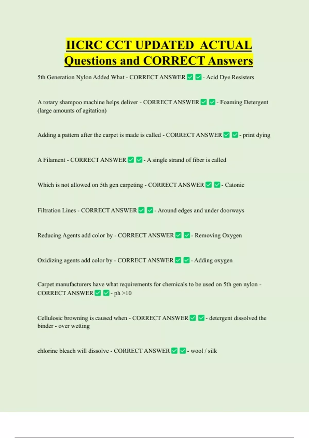 IICRC CCT UPDATED ACTUAL Questions and CORRECT Answers 5th Generation Nylon Added What - CORRECT ANSWER A rotary shampoo machine helps deliver - CORRECT ANSWER (large amounts of agitation) - Acid Dye Resisters - Foaming Detergent Adding a pattern after the carpet is made is called - CORRECT ANSWER A Filament - CORRECT ANSWER - A single strand of fiber is called