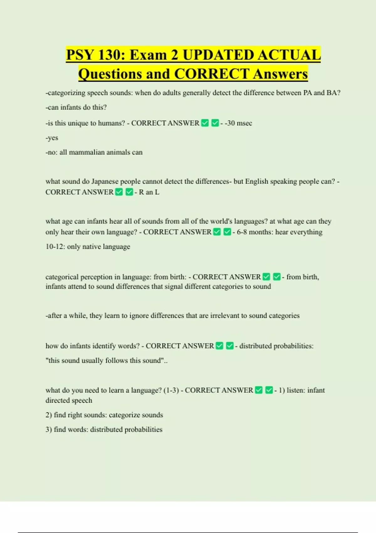 PSY 130: Exam 2 UPDATED ACTUAL Questions and CORRECT Answers -categorizing speech sounds: when do adults generally detect the difference between PA and BA? -can infants do this? -is this unique to humans? - CORRECT ANSWER -yes -no: all mammalian animals can - -30 msec what sound do Japanese people cannot detect the differences- but English speaking people can? - CORRECT ANSWER - R an L