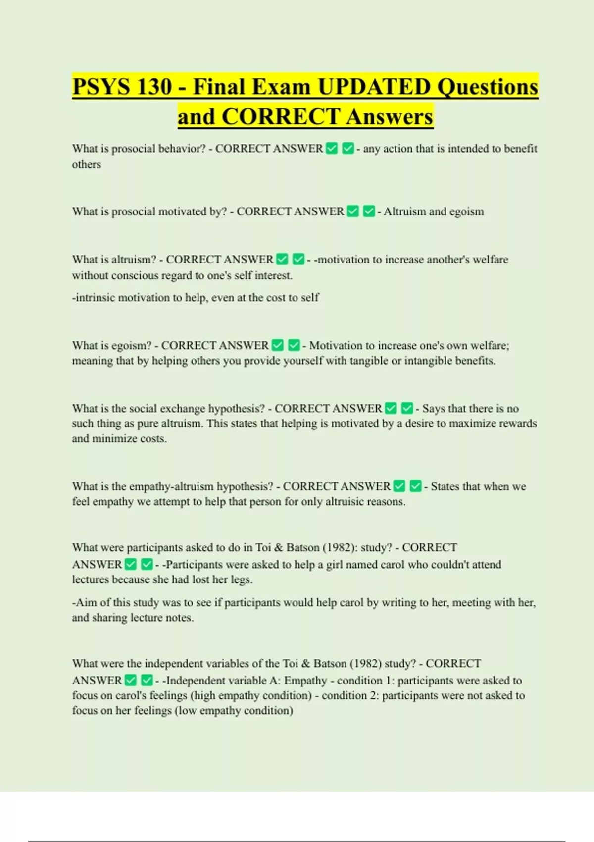 PSYS 130 - Final Exam UPDATED Questions and CORRECT Answers What is prosocial behavior? - CORRECT ANSWER others What is prosocial motivated by? - CORRECT ANSWER What is altruism? - CORRECT ANSWER - any action that is intended to benefit - Altruism and egoism - -motivation to increase another's welfare without conscious regard to one's self interest. -intrinsic motivation to help, even at the cost to s