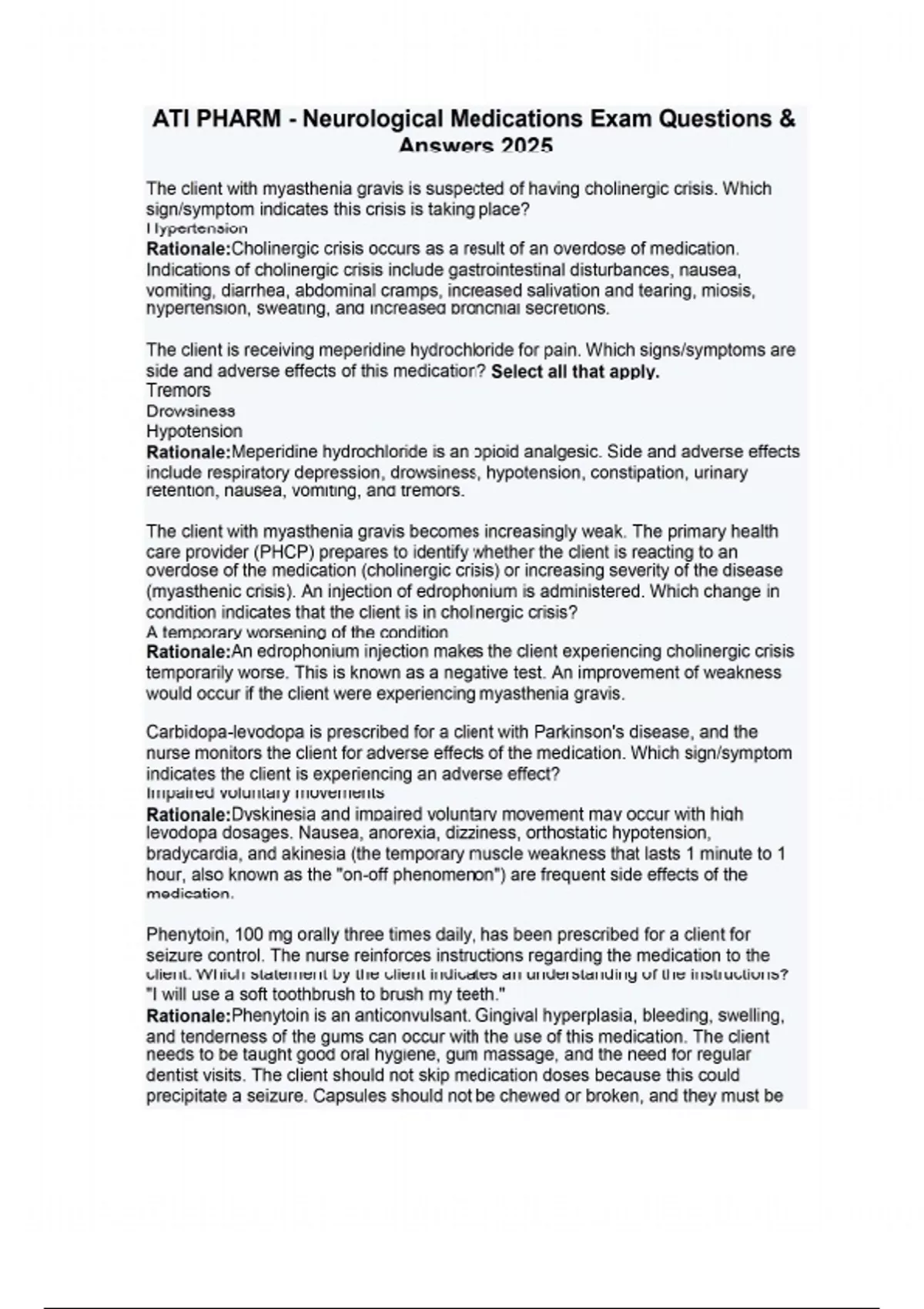 ATI PHARM - Neurological Medications Exam Questions & Answers 2025