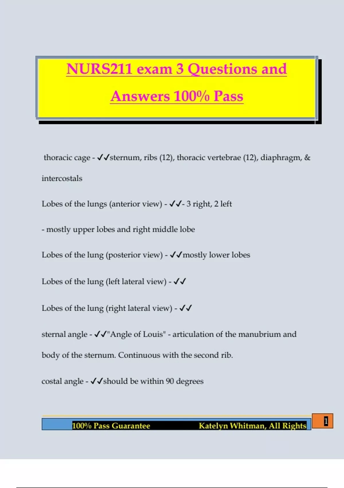NURS211 exam 3 Questions and Answers 100% Pass thoracic cage - sternum, ribs (12), thoracic vertebrae (12), diaphragm, & intercostals Lobes of the lungs (anterior view) - - 3 right, 2 left - mostly upper lobes and right middle lobe Lobes of the lung (posterior view) - mostly lower lobes Lobes of the lung (left lateral view) - Lobes of the lung (right lateral view) - sternal angle - "Angle of Louis" - articulation of the manubrium and body of the sternum. Continuous with the second rib. costal angle - should be within 90 degrees 2 100% Pass Guarantee Katelyn Whitman, All Rights Mediastinum - - middle of thoracic cavity - contains esophagus, trachea, heart, and great vessels Mechanics of respiration - - inspiration: diaphragm contracts, abdomen moves out - exhalation: diaphragm expands and relaxes anteroposterior diameter should be ___ than transverse diameter - less (normal = 1:2) tactile fremitus - - palpable vibration - generated from larynx - have patient repeat the word "ninety-nine" during palpation - most intensely heard between the scapulae tactile fremitus increases with - hyperinflation (COPD, emphysema, asthma) tactile fremitus decreases with - consolidation (pneumonia, tumor) 3 100% Pass Guarantee Katelyn Whitman, All Rights Abnormal finding: barrel chest - - lungs are chronically overinflated with air - rib cage stays partially expanded all the time - gradual 1:1 ratio - may occur in people with COPD, emphysema abnormal finding: pectus excavatum - - sternum and ribcage are concave - either present at birth or developed during puberty abnormal findings: pectus carinatum - - "pigeon chest" - sternum and ribs protrude abnormal findings: flail chest - - **life-threatening medical condition** - portion of rib cage is separated from chest wall - usually due to severe blunt trauma (ex. serious fall, car accident) Scoliosis - abnormal lateral curvature of the spine kyphosis - hunchback 4 100% Pass Guarantee Katelyn Whitman, All Rights lung auscultation: anterior - - use a "z" motion - 10 spots - should listen to at least 1 full respiration at each spot lung auscultation: posterior - - use a "z" motion - 18 spots - should listen to at least 1 full respiration at each spot egophany - - increased resonance of voice sounds heard when auscultating the lungs - caused by lung consolidation, fluid in lungs, or fibrosis - "E" to "A" sound change Bronchophany - - abnormal transmission of sounds from the lungs or bronchi - may indicate consolidation whispered pectoriloquy - - whispered sounds heard loudly and clearly upon thoracic auscultation 5 100% Pass Guarantee Katelyn Whitman, All Rights - normally, whispered sounds would not be heard normal (vesicular) breath sounds - - soft - non-musical bronchial/tracheal/tubular breath sounds - - Loud - hollow bronchovesicular breath sounds - - normal bre