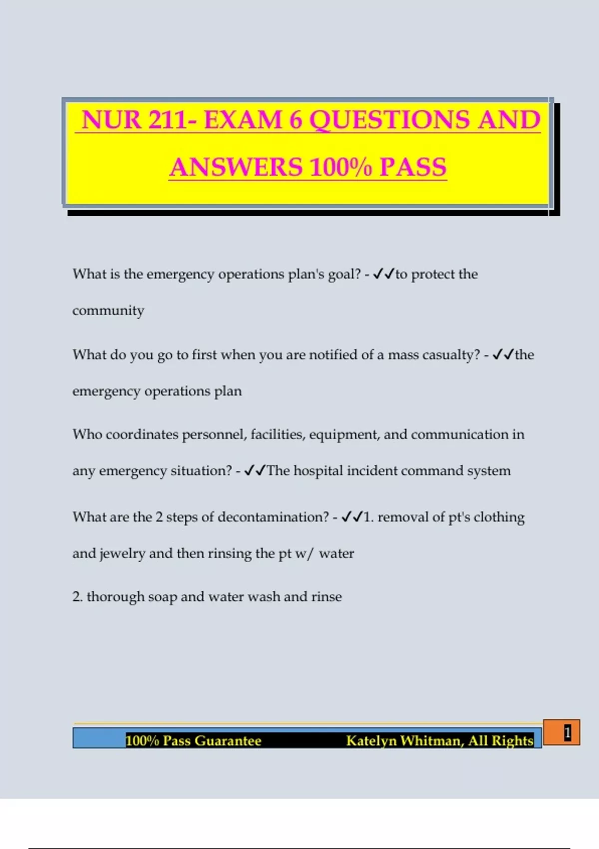 NUR 211- EXAM 6 QUESTIONS AND ANSWERS 100% PASS What is the emergency operations plan's goal? - to protect the community What do you go to first when you are notified of a mass casualty? - the emergency operations plan Who coordinates personnel, facilities, equipment, and communication in any emergency situation? - The hospital incident command system What are the 2 steps of decontamination? - 1. removal of pt's clothing and jewelry and then rinsing the pt w/ water 2. thorough soap and water wash and rinse 2 100% Pass Guarantee Katelyn Whitman, All Rights What does level D PPE consist of? - generally not adequate for protection from a patient who has been chemically, biologically, or radiologically contaminated What does level C PPE consist of? - is adequate for the average patient exposure; consists of an air purified respirator, chemical resistant suit, gloves, and hood. What are decisions of care based on during a disaster? - the likelihood of survival and consumption of available resources What is a black tag? - -Injured personas who are beyond the scope of medical assistance OR -Deceased What is a red tag? - -Injured persons who must be assisted by advanced medical care IMMEDIATELY or within the next hour What is a yellow tag? - -Injured persons who are medically stable but require medical assistance but care is DELAYED 3 100% Pass Guarantee Katelyn Whitman, All Rights What is a green tag? - -Injured persons who do not need medical care for at least several hours and can usually walk. Mainly consist of bandages and acute first aid CAN LEAVE What is the Nurse's role in a disaster situation? - (may be asked to perform duties outside of their expertise) -delegation -triage -fair allocation of resources -providing counseling -knowing the hospital disaster plan -participating in disaster drills -honing in on competencies r/t disaster manageme