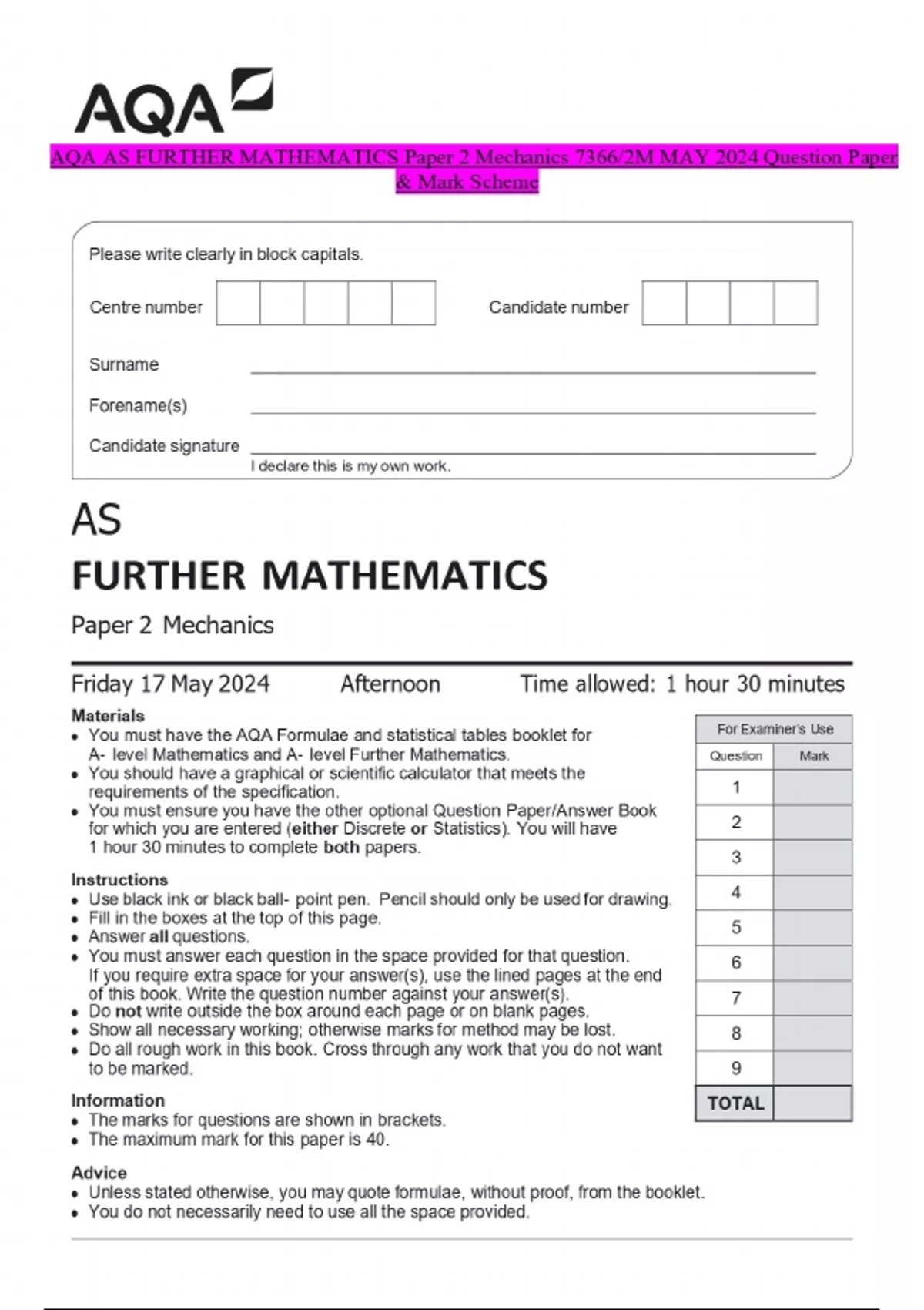 AQA AS FURTHER MATHEMATICS Paper 2 Mechanics 7366/2M MAY 2024 Question Paper & Mark Scheme