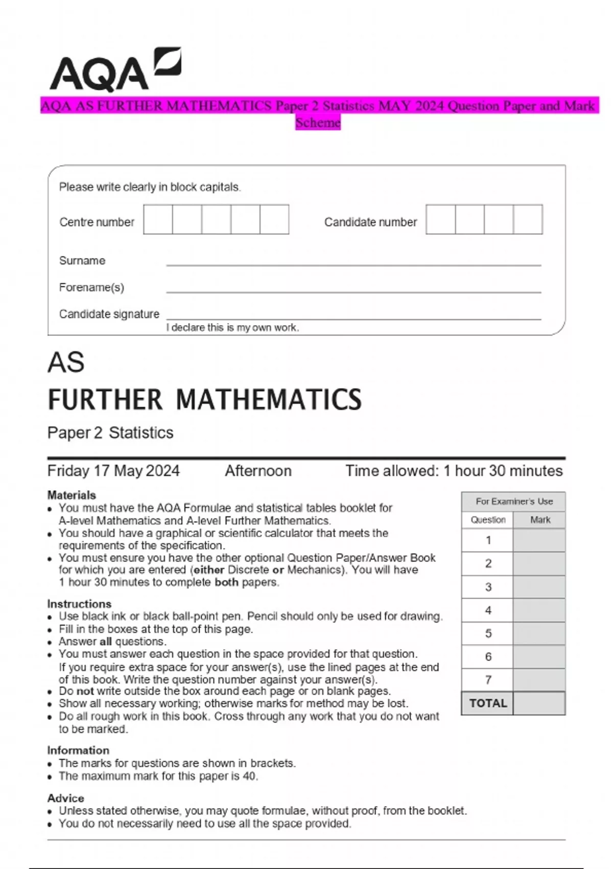 AQA AS FURTHER MATHEMATICS Paper 2 Statistics MAY 2024 Question Paper and Mark Scheme