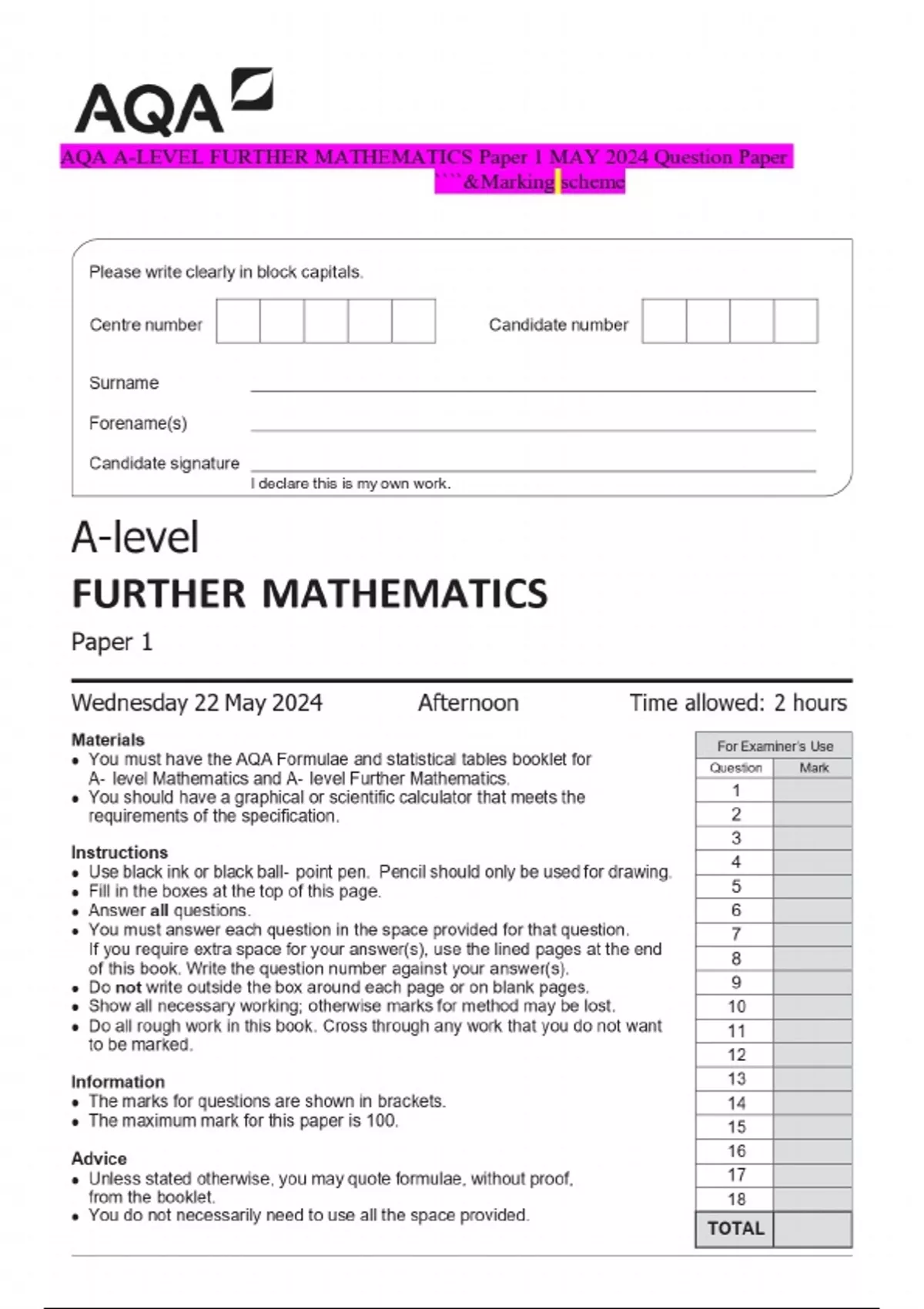 AQA A-LEVEL FURTHER MATHEMATICS Paper 1 MAY 2024 Question Paper ````&Marking scheme