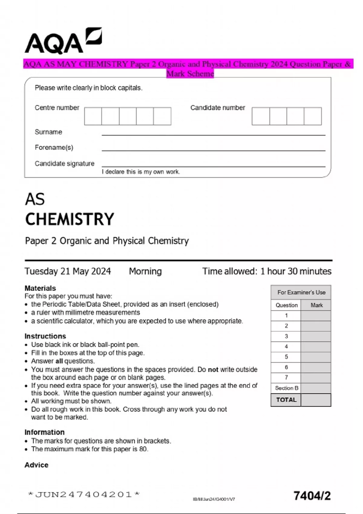 AQA AS MAY CHEMISTRY Paper 2 Organic and Physical Chemistry 2024 Question Paper & Mark Scheme