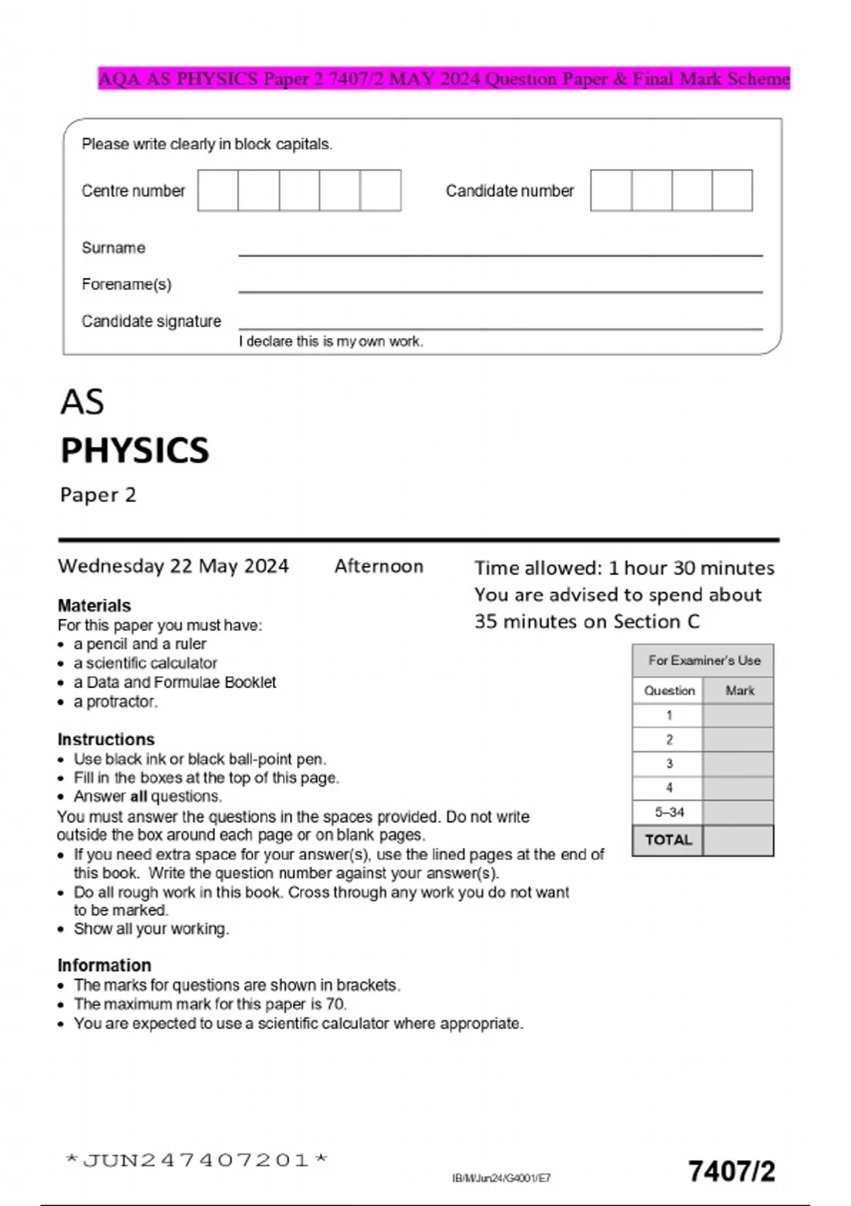 AQA AS PHYSICS Paper 2 7407/2 MAY 2024 Question Paper & Final Mark Sche