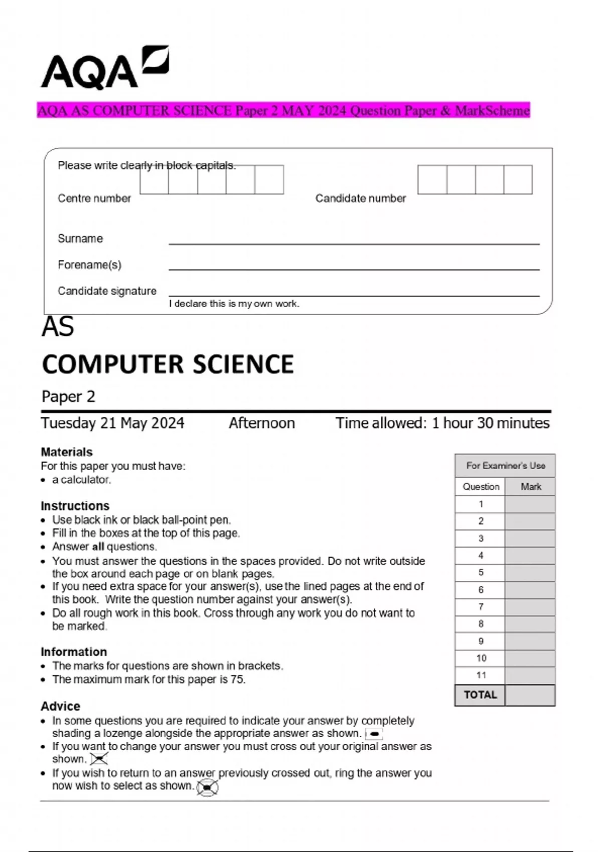AQA AS COMPUTER SCIENCE Paper 2 MAY 2024 Question Paper & MarkScheme