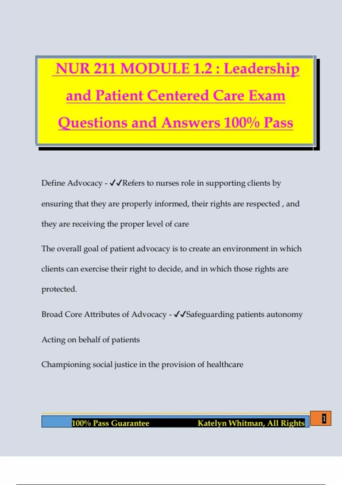 NUR 211 MODULE 1.2 : Leadership and Patient Centered Care Exam Questions and Answers 100% Pass Define Advocacy - Refers to nurses role in supporting clients by ensuring that they are properly informed, their rights are respected , and they are receiving the proper level of care The overall goal of patient advocacy is to create an environment in which clients can exercise their right to decide, and in which those rights are protected. Broad Core Attributes of Advocacy - Safeguarding patients autonomy Acting on behalf of patients Championing social justice in the provision of healthcare 2 100% Pass Guarantee Katelyn Whitman, All Rights How can nurses safeguard autonomy? - Encourage patients to share and document theirs goals, preferences, values and beliefs Supporting the patients values and choices even when they conflict with your own. Providing sufficient, timely information for informed decisions Be sure there is a match between the patients health literacy level and the information provided Important points to consider - Nurses are ethically obligated to act as advocates for all patients, but particularly for those who cannot advocate for themselves Occurs at any level, in any setting Direct patient care Change in public policy or services One can advocate for an individual Did you know? - Nurses have ethical and professional responsibility for protecting the safety and rights of their patients 3 100% Pass Guarantee Katelyn Whitman, All Rights The Code of Ethics identifies a range of advocacy skills and activities that nurses are expected to demonstrate Nurse Practice Act - Nurses who understand their state practice acts are best able to use established processes to advocate effectively for their patients while protecting themselves from retaliation and from violations against their license. List 5 advocacy skills - Risk Tasking Articulate communication Assertiveness Self-Confidence Collaboration What are some situations where nurse would have to advocate for clients? - End of life decisions Access to health care Protection of client privacy 4 100% Pass Guarantee Katelyn Whitman, All Rights Informed consent Issues that may cause harm to people Substandard practice (impaired nurse, abuse of power) Political issue, law making How Do You Show Advocacy? - What beha