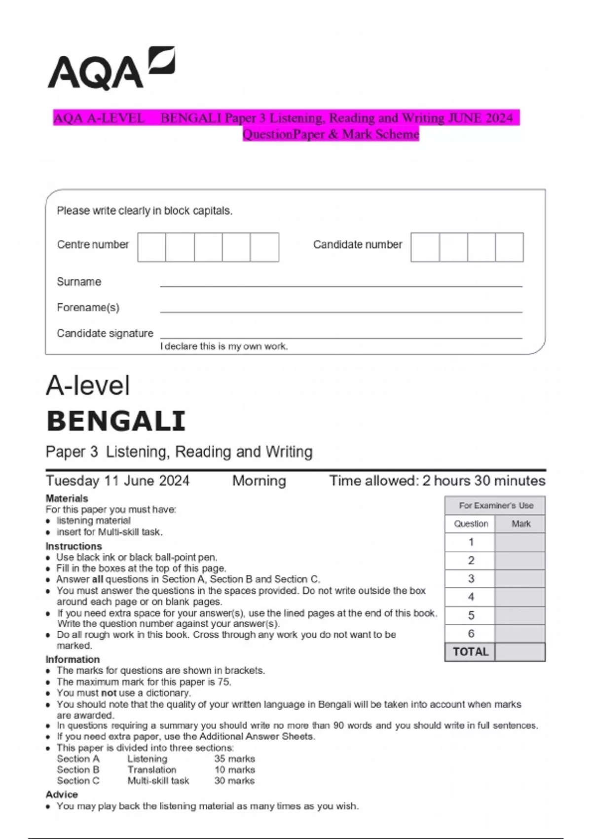 AQA A-LEVEL BENGALI Paper 3 Listening, Reading and Writing JUNE 2024 QuestionPaper & Mark Scheme