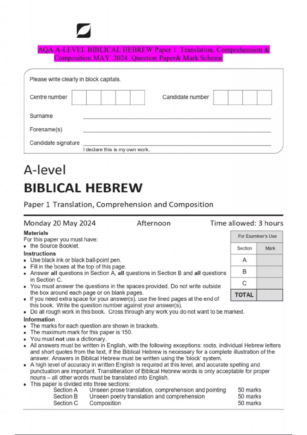 AQA A-LEVEL BIBLICAL HEBREW Paper 1 Translation, Comprehension & Composition MAY 2024 Question Paper& Mark Scheme