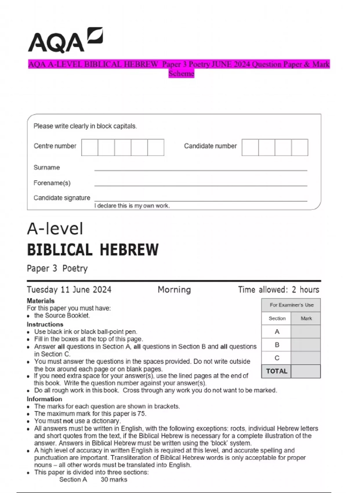 AQA A-LEVEL BIBLICAL HEBREW Paper 3 Poetry JUNE 2024 Question Paper & Mark Scheme