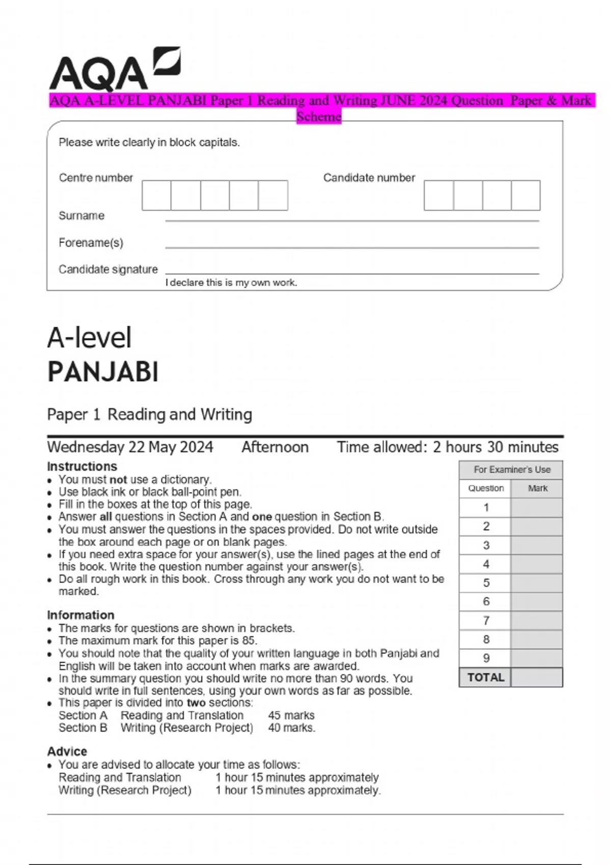 AQA A-LEVEL PANJABI Paper 1 Reading and Writing JUNE 2024 Question Paper & Mark Scheme