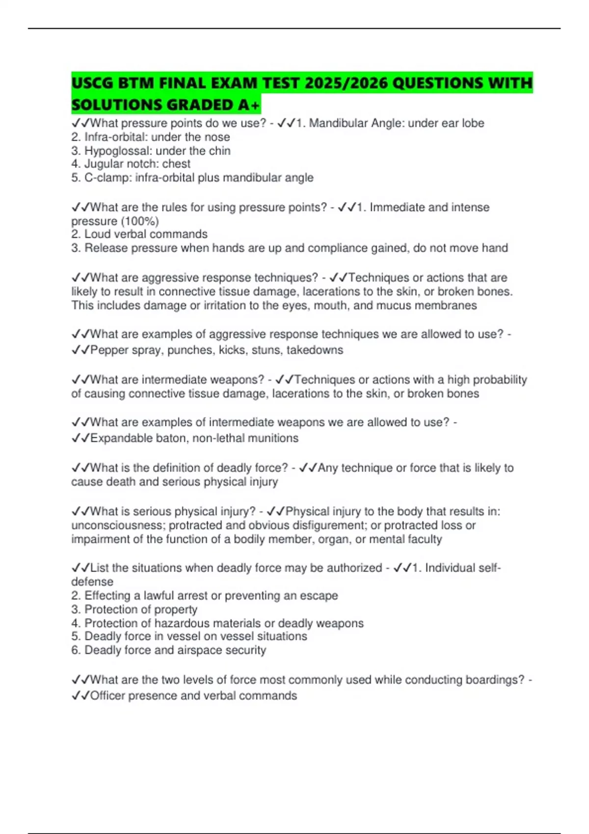 ✔✔What is the definition of deadly force? - ✔✔Any technique or force that is likely to