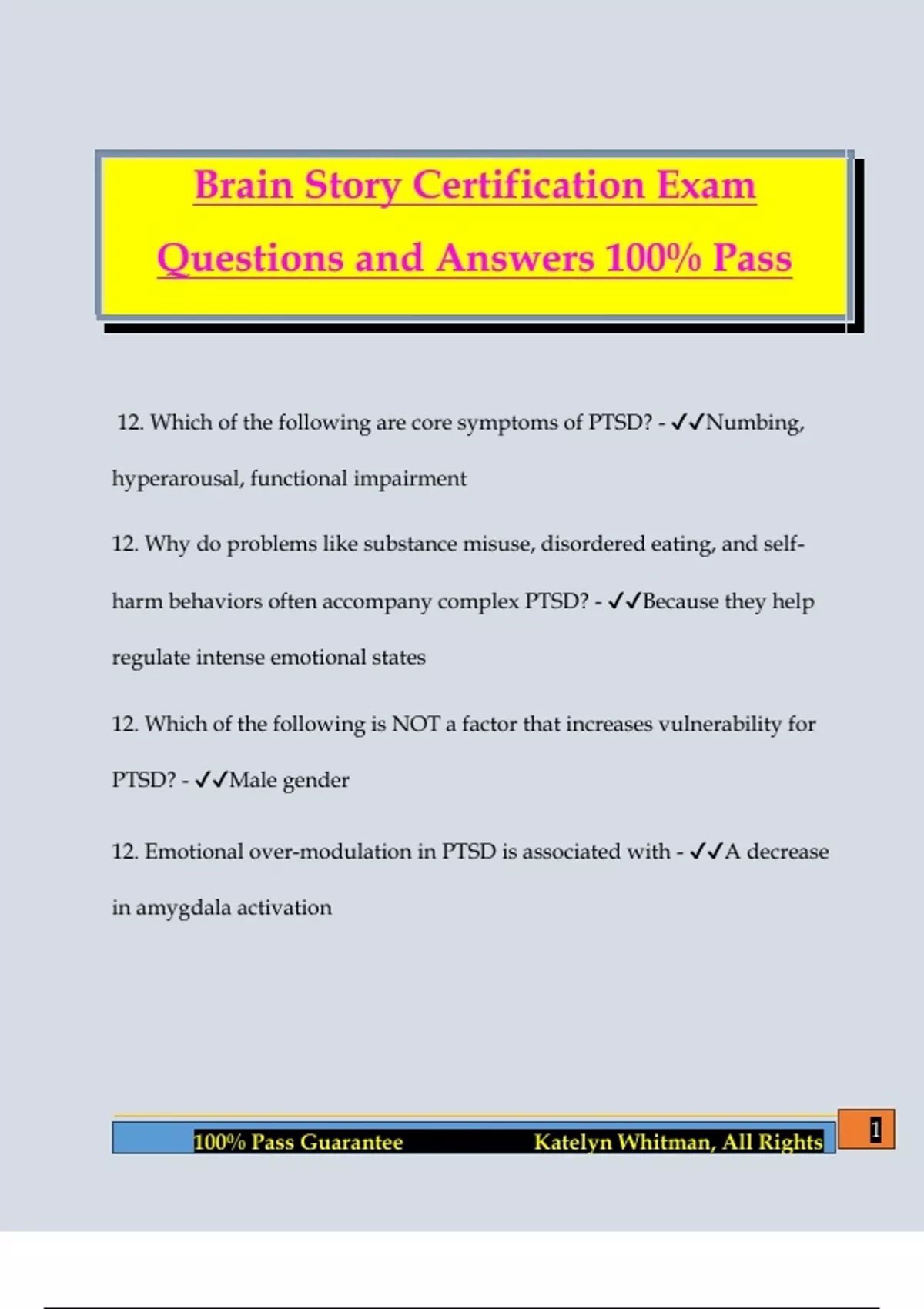 Brain Story Certification Exam Questions and Answers 100% Pass 12. Which of the following are core symptoms of PTSD? - Numbing, hyperarousal, functional impairment 12. Why do problems like substance misuse, disordered eating, and self- harm behaviors often accompany complex PTSD? - Because they help regulate intense emotional states 12. Which of the following is NOT a factor that increases vulnerability for PTSD? - Male gender 12. Emotional over-modulation in PTSD is associated with - A decrease in amygdala activation 2 100% Pass Guarantee Katelyn Whitman, All Rights 12. The interpersonal dysfunction that is part of PTSD includes - All of the above: social isolation, difficulties with child rearing, problems functioning at work 12. Two key brain structures involved in depression are - The amygdala and hippo campus 12. What common signaling system most likely underlies the strong association between depression and physical illnesses such as heart disease, diabetes, and obesity? - Stress system 4. Human infants need to be taught how to react to social cues by: - Nothing - Infants have an innate ability to respond to social cues (trick question suckka) 4. How do social interactions with attentive adults support learning in children? - All of the above: They direct the child's attention to important aspects of the task, they make learning fun for the child, they can be used to adapt the learning to meet an individual child's needs. 3 100% Pass Guarantee Katelyn Whitman, All Rights 4. In child development, joint attention refers to: - The infant co- ordinates his or her attention with an adult and another object in the environment. 4. Which of the following factors is most likely to increase the quality and quantity of serve-and-return interactions for a child? - Secure attachment 4. Which aspect of development is NOT affected by social interactions? - None of the above 4. What brain region is most involved in behavioral inhibition? - The amygdala 10. Which of the following adverse childhood experiences was not included as part of the ACE Study? - Growing up inf