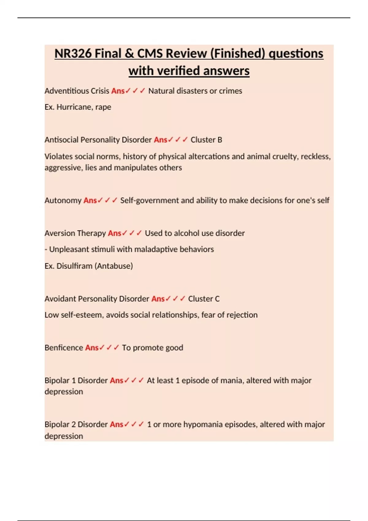Adventitious Crisis Ans Natural disasters or crimes Ex. Hurricane, rape Antisocial Personality Disorder Ans Cluster B Violates social norms, history of physical altercations and animal cruelty, reckless, aggressive, lies and manipulates others Autonomy Ans Self-government and ability to make decisions for one's self Aversion Therapy Ans Used to alcohol use disorder - Unpleasant stimuli with maladaptive behaviors Ex. Disulfiram (Antabuse) Avoidant Personality Disorder Ans Cluster C Low self-esteem, avoids social relationships, fear of rejection Benficence Ans To promote good Bipolar 1 Disorder Ans At least 1 episode of mania, altered with major depression