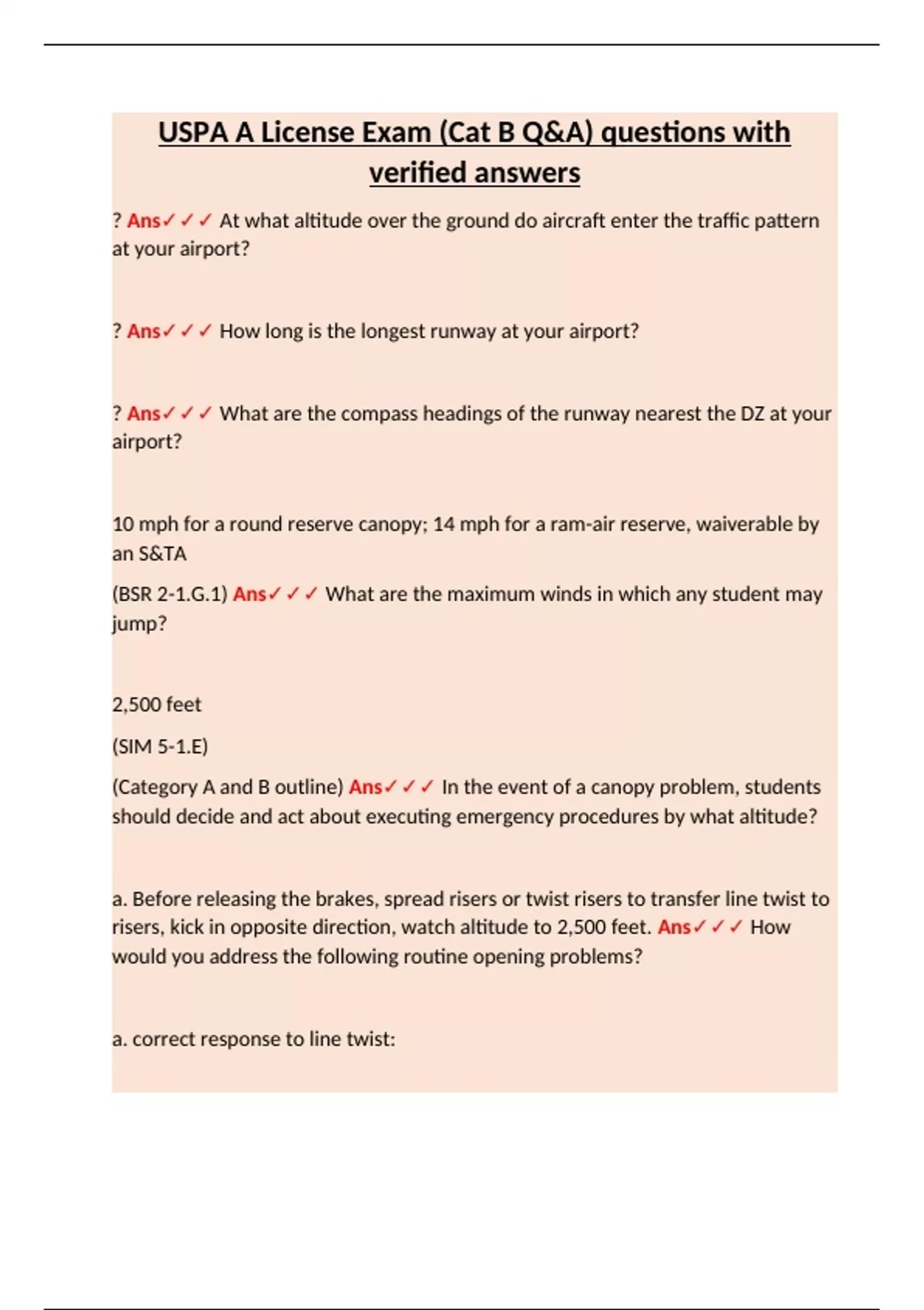 USPA A License Exam (Cat B Q&A) questions with verified answers