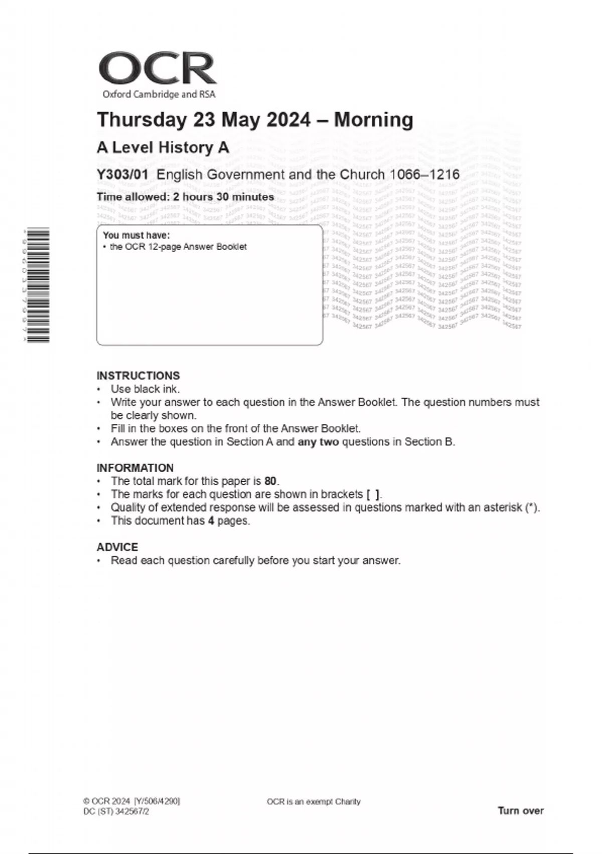 OCR A Level History A Y303/01 English Government and the Church 1066–1216 MAY 2024 Question Paper and Mark Scheme