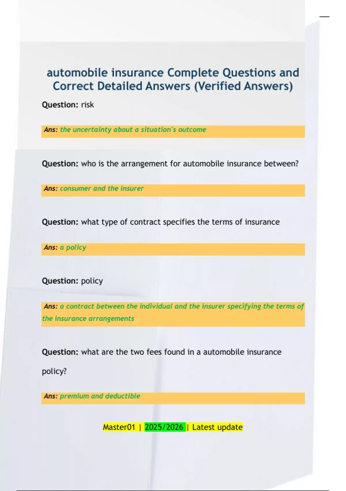 automobile insurance Complete Questions and Correct Detailed Answers (Verified Answers)