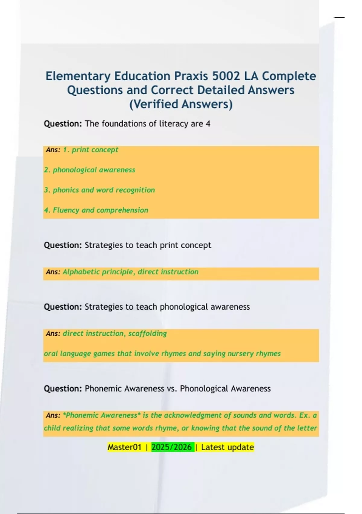 Elementary Education Praxis 5002 LA Complete Questions and Correct Detailed Answers (Verified Answers)