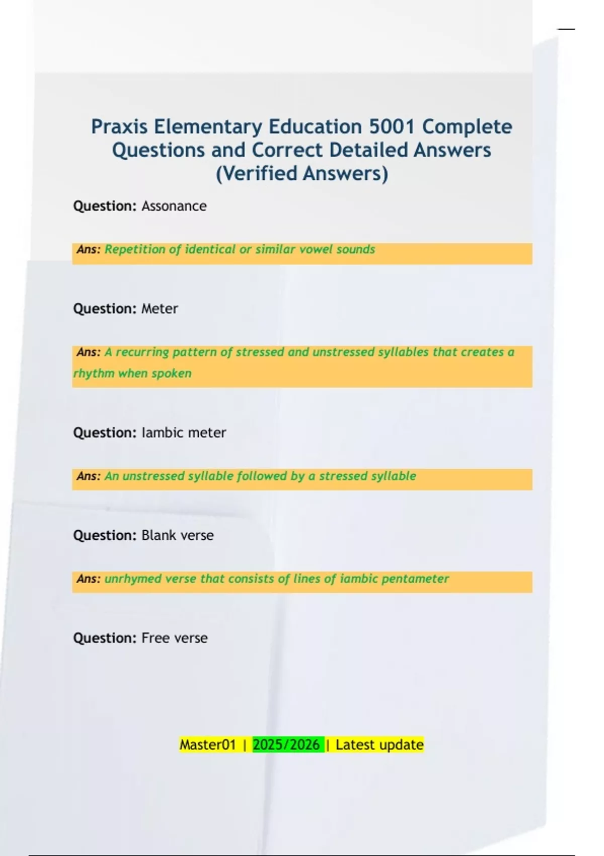 Praxis Elementary Education 5001 Complete Questions and Correct Detailed Answers (Verified Answers)