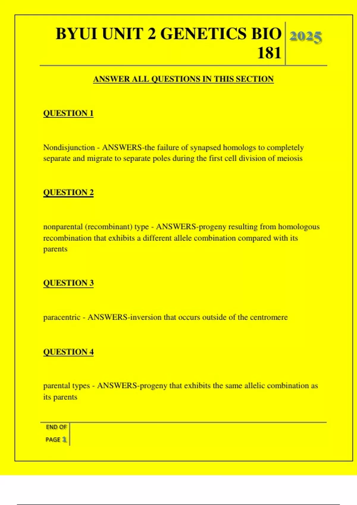 BYUI UNIT 2 GENETICS BIO 181 QUESTIONS AND ANSWERS 2025