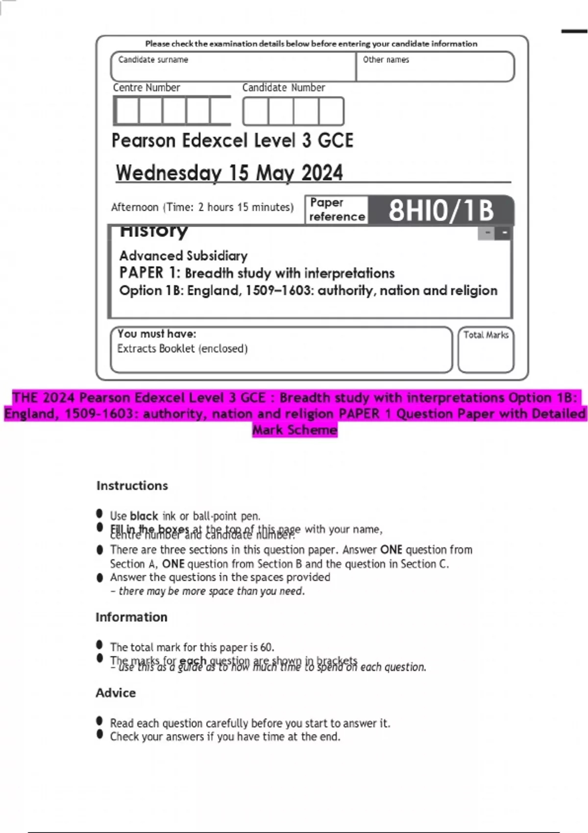 THE 2024 Pearson Edexcel Level 3 GCE : Breadth study with interpretations Option 1B: England, 1509–1603: authority, nation and religion PAPER 1 Question Paper with Detailed Mark Scheme