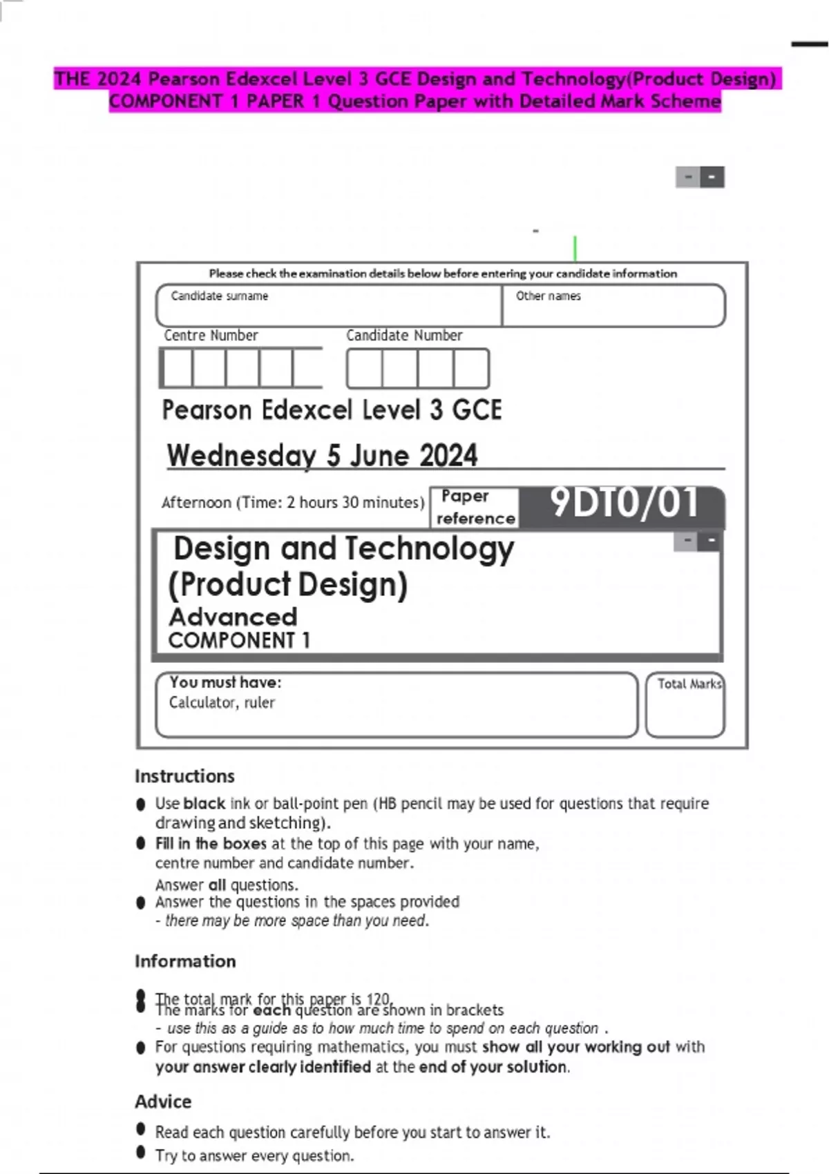 THE 2024 Pearson Edexcel Level 3 GCE Design and Technology(Product Design) COMPONENT 1 PAPER 1 Question Paper with Detailed Mark Scheme