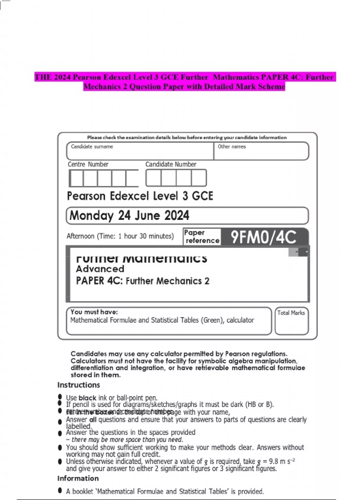 THE 2024 Pearson Edexcel Level 3 GCE Further Mathematics PAPER 4C: Further Mechanics 2 Question Paper with Detailed Mark Scheme