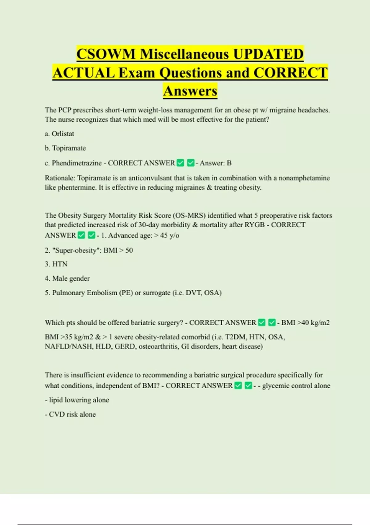 CSOWM Miscellaneous UPDATED ACTUAL Exam Questions and CORRECT Answers The PCP prescribes short-term weight-loss management for an obese pt w/ migraine headaches. The nurse recognizes that which med will be most effective for the patient? a. Orlistat b. Topiramate c. Phendimetrazine - CORRECT ANSWER - Answer: B Rationale: Topiramate is an anticonvulsant that is taken in combination with a nonamphetamine like phentermine. It is effective in reducing migraines & treating obesity