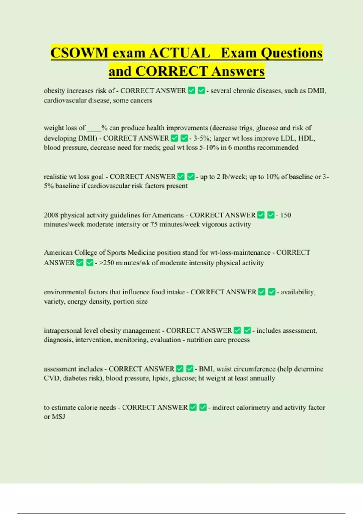 CSOWM exam ACTUAL Exam Questions and CORRECT Answers obesity increases risk of - CORRECT ANSWER cardiovascular disease, some cancers - several chronic diseases, such as DMII, weight loss of ____% can produce health improvements (decrease trigs, glucose and risk of developing DMII) - CORRECT ANSWER - 3-5%; larger wt loss improve LDL, HDL, blood pressure, decrease need for meds; goal wt loss 5-10% in 6 months recommended