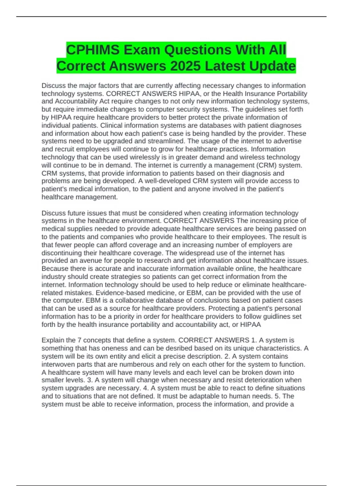 CPHIMS Exam Questions With All Correct Answers 2025 Latest Update