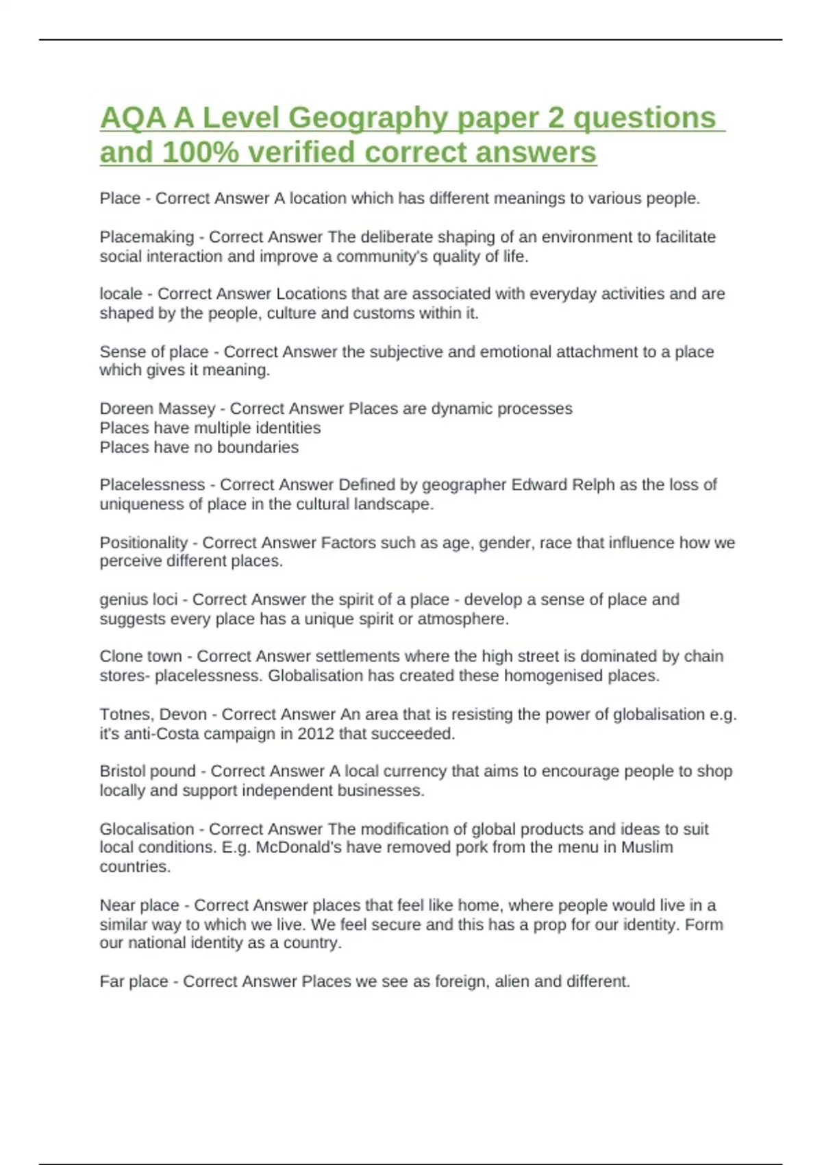 AQA A Level Geography paper 2 questions and 100% verified correct answers Place - Correct Answer A location which has different meanings to various people. Placemaking - Correct Answer The deliberate shaping of an environment to facilitate social interaction and improve a community's quality of life. locale - Correct Answer Locations that are associated with everyday activities and are shaped by the people, culture and customs within it. Sense of place - Correct Answer the subjective and emotional attachment to a place which gives it meaning. Doreen Massey - Correct Answer Places are dynamic processes Places have multiple identities Places have no boundaries Placelessness - Correct Answer Defined by geographer Edward Relph as the loss of uniqueness of place in the cultural landscape. Positionality - Correct Answer Factors such as age, gender, race that influence how we perceive different places. genius loci - Correct Answer the spirit of a place - develop a sense of place and suggests every place has a unique spirit or atmosphere. Clone town - Correct Answer settlements where the high street is dominated by chain stores- placelessness. Globalisation has created these homogenised places. Totnes, Devon - Correct Answer An area that is resisting the power of globalisation e.g. it's anti-Costa campaign in 2012 that succeeded. Bristol pound - Correct Answer A local currency that aims to encourage people to shop locally and support independent businesses. Glocalisation - Correct Answer The modification of global products and ideas to suit local conditions. E.g. McDonald's have removed pork from the menu in Muslim countries. Near place - Correct Answer places that feel like home, where people would live in a similar way to which we live. We feel secure and this has a prop for our identity. Form our national identity as a country. Far place - Correct Answer Places we see as foreign, alien and different.