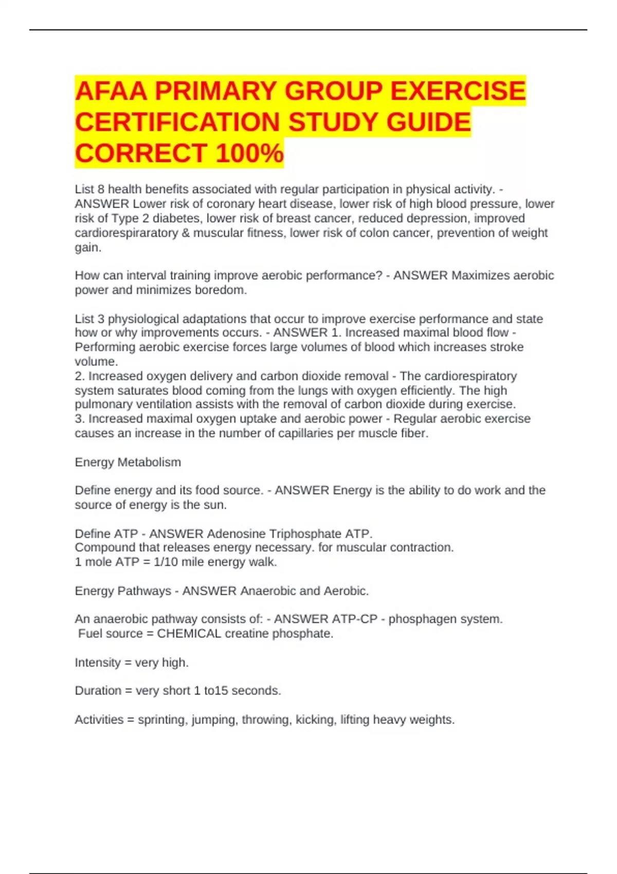 AFAA PRIMARY GROUP EXERCISE CERTIFICATION STUDY GUIDE CORRECT 100%