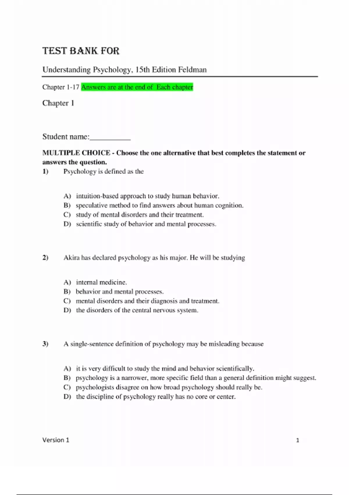 Test Bank For Understanding Psychology, 15th Edition By Feldman| All Chapters (1-17) | Newest Version 2024 A+ Test Bank for Understanding Psychology, 15th Edition Feldman Chapter 1-17 Answers are at the end of Each chapter Chapter 1 Student name:__________ MULTIPLE CHOICE - Choose the one alternative that best completes the statement or answers the question. 1) Psychology is defined as the A) intuition-based approach to study human behavior. B) speculative method to find answers about human cognition. C) study of mental disorders and their treatment. D) scientific study of behavior and mental processes. 2) Akira has declared psychology as his major. He will be studying A) internal medicine. B) behavior and mental processes. C) mental disorders and their diagnosis and treatment. D) the disorders of the central nervous system. 3) A single-sentence definition of psychology may be misleading because A) it is very difficult to study the mind and behavior scientifically. B) psychology is a narrower, more specific field than a general definition might suggest. C) psychologists disagree on how broad psychology should really be. D) the discipline of psychology really has no core or center. 4) In order to study mind and behavior, psychologists A) rely on the scientific method. B) use their intuition. C) rely on the study of internal medicine. D) use speculation. 5) In which of the following scenarios is a scientific explanation being provided to explain a phenomenon? A) When asked if violent video games have an impact on players, Dr. Lee replies that there is substantial empirical evidence to suggest a change in the gamers' behavior. B) When asked if mood influences social behavior, Dr. Sessler replies that he believes that it does. C) When asked if addiction is a disease or a choice, Dr. Smith replies that he knows many addicts and he feels that they have a disease. D) When asked if he can train his mind to not feel physical pain, Dr. Farnworth replies that he focuses on his breathing when he feels pain to increase his tolerance for it. 6) Which of the following statements accurately describes the diverse subfields of psychology? A) They allow psychologists to explain different types of behavior using the same techniques and experiments. B) Though they are individually separate and distinct, they all share a common goal of understanding behavior. C) They always lead to an MD (doctor of medicine) degree. D) They are not related at all other than being considered a part of psychology. 7) Dr. Alvarez is currently studying how the degeneration of certain components of nerve cells in the brain leads to Lewy body disease. Dr. Alvarez's work is most likely to be a part of the ________ subfield of psychology