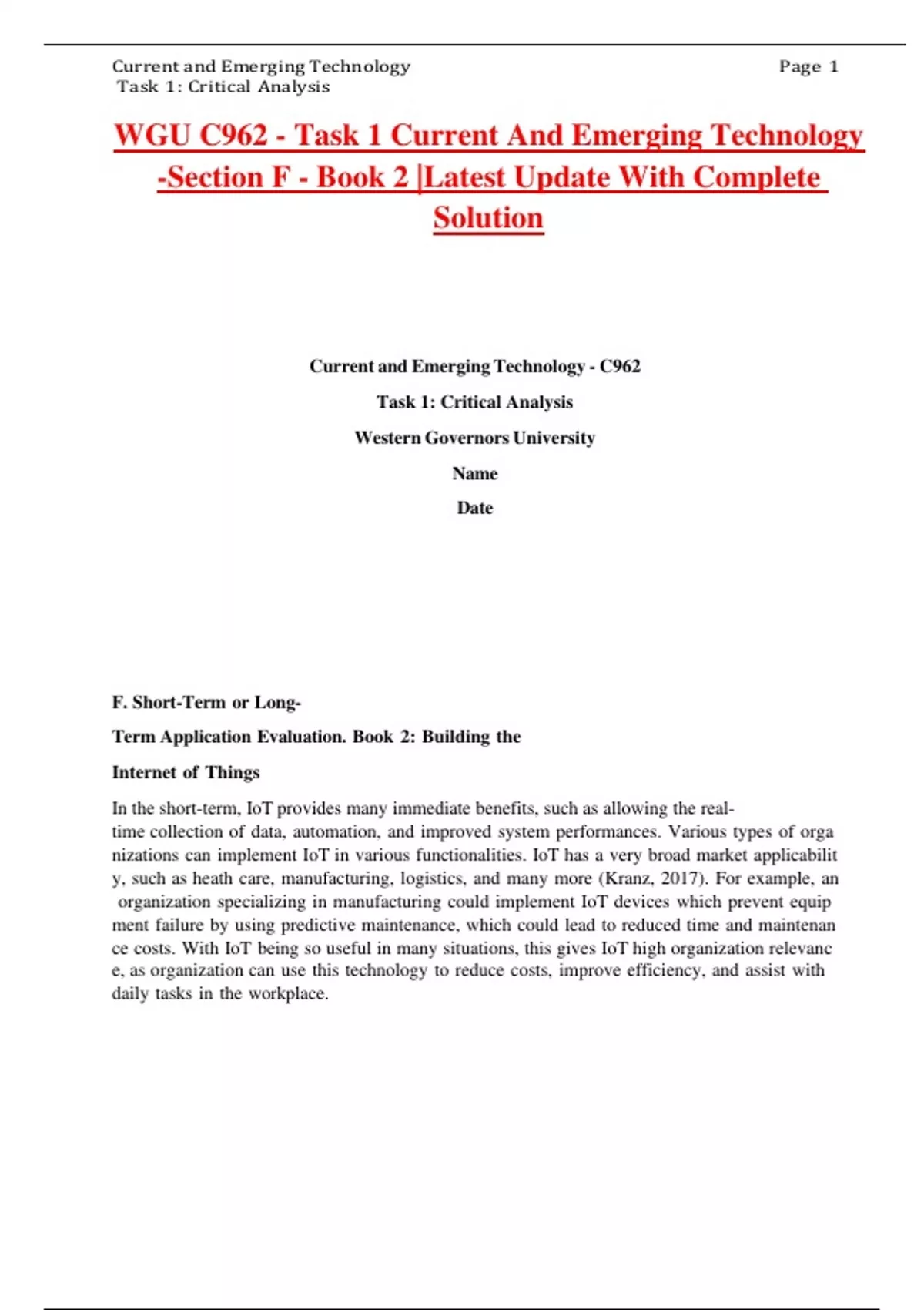WGU C962 - Task 1 Current And Emerging Technology