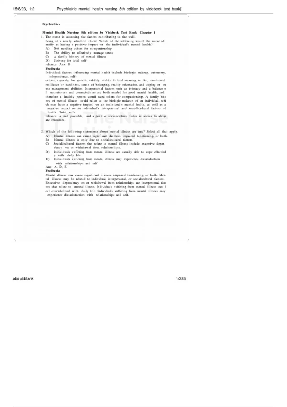 15/6/23,m1:2 Psychiatric mmentalmhealthmnursingm8thmeditionmby mvidebeckmtestmbank[m