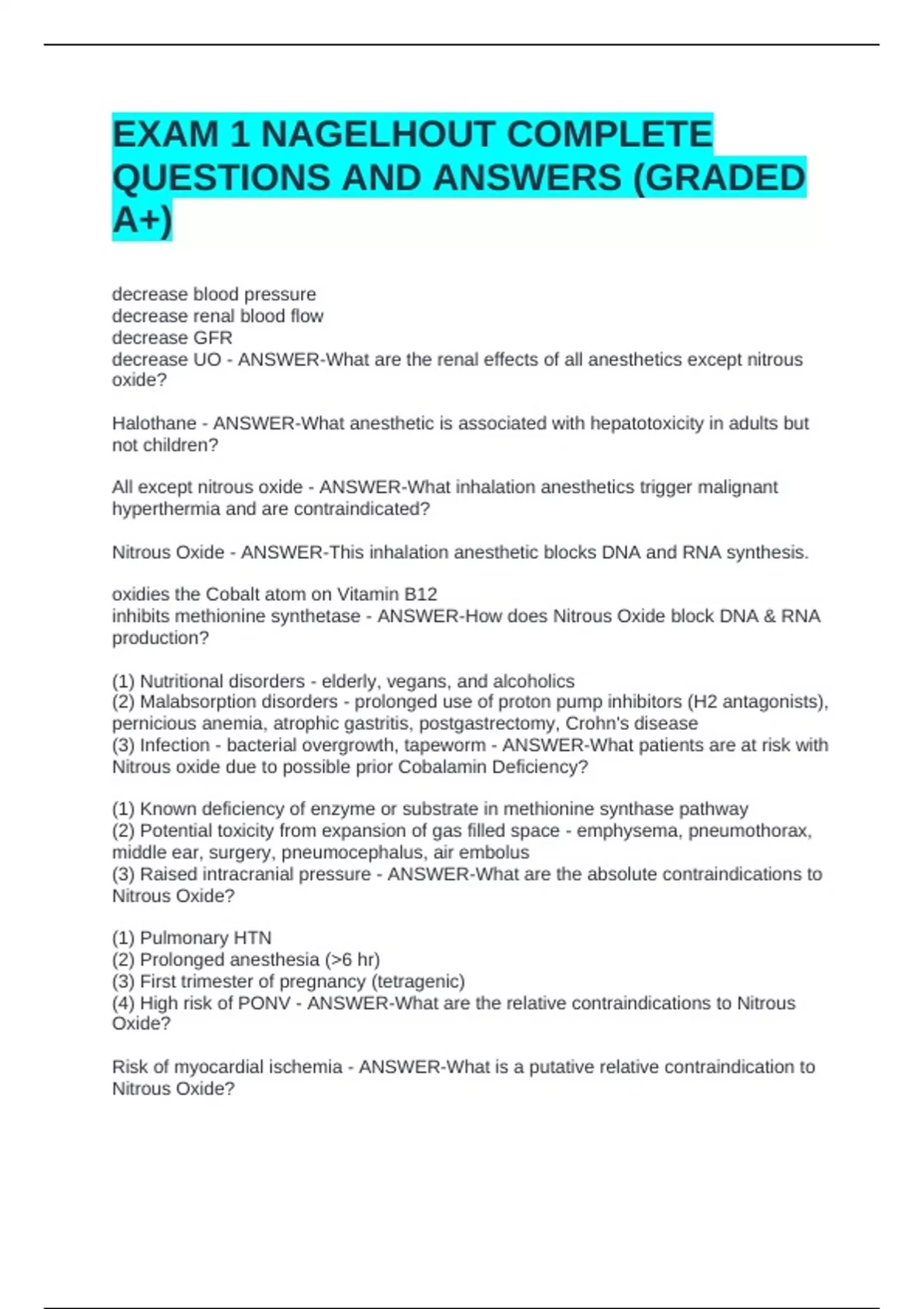 Nitrous oxide (teratogenic in animals) - ANSWER-What anesthetic is contraindicated in
